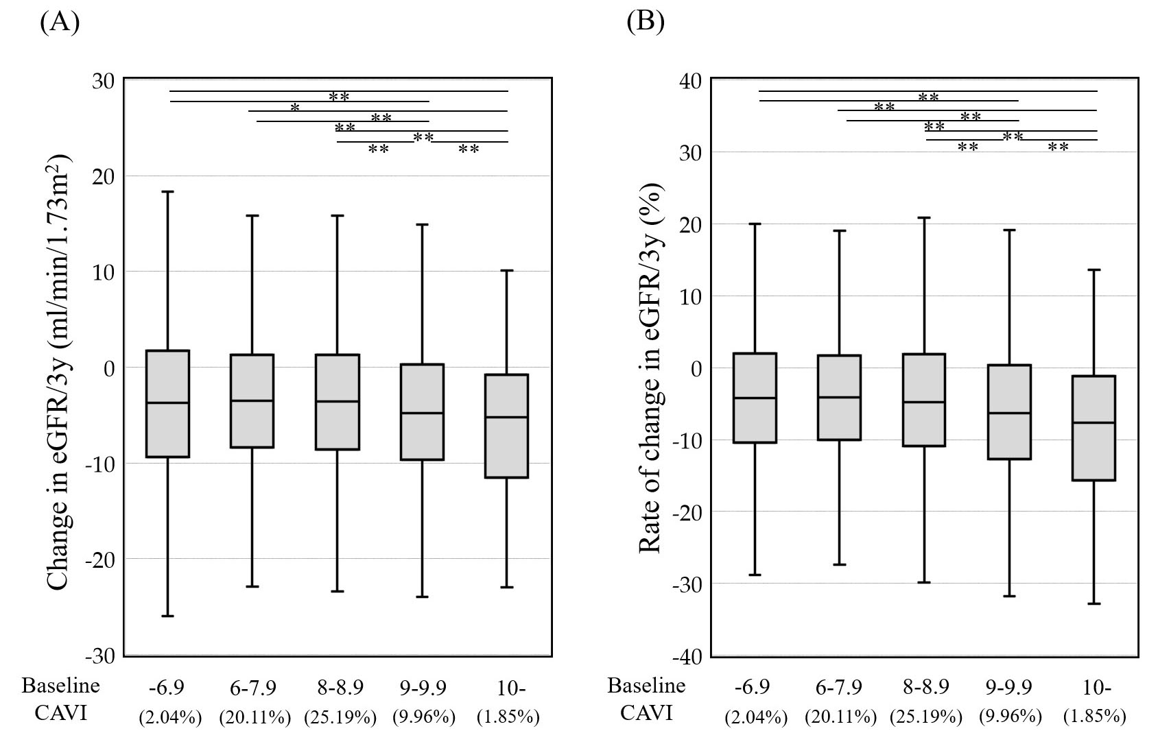 In general, increased CAVI precedes kidney function decline. Fig. 1 (Ref. [28]) shows the relationship of baseline CAVI with a change in kidney function over 3 consecutive years. Among Japanese individuals who underwent health screening, a baseline CAVI above 9 was associated with a greater decline in kidney function.