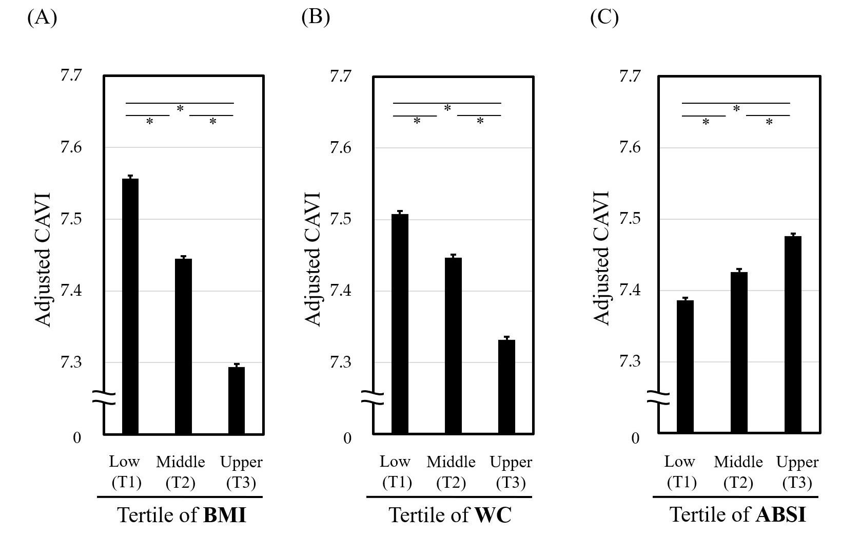 Fig. 2. Relationship of CAVI with tertiles of (A) BMI, (B) WC and (C) ABSI. *p