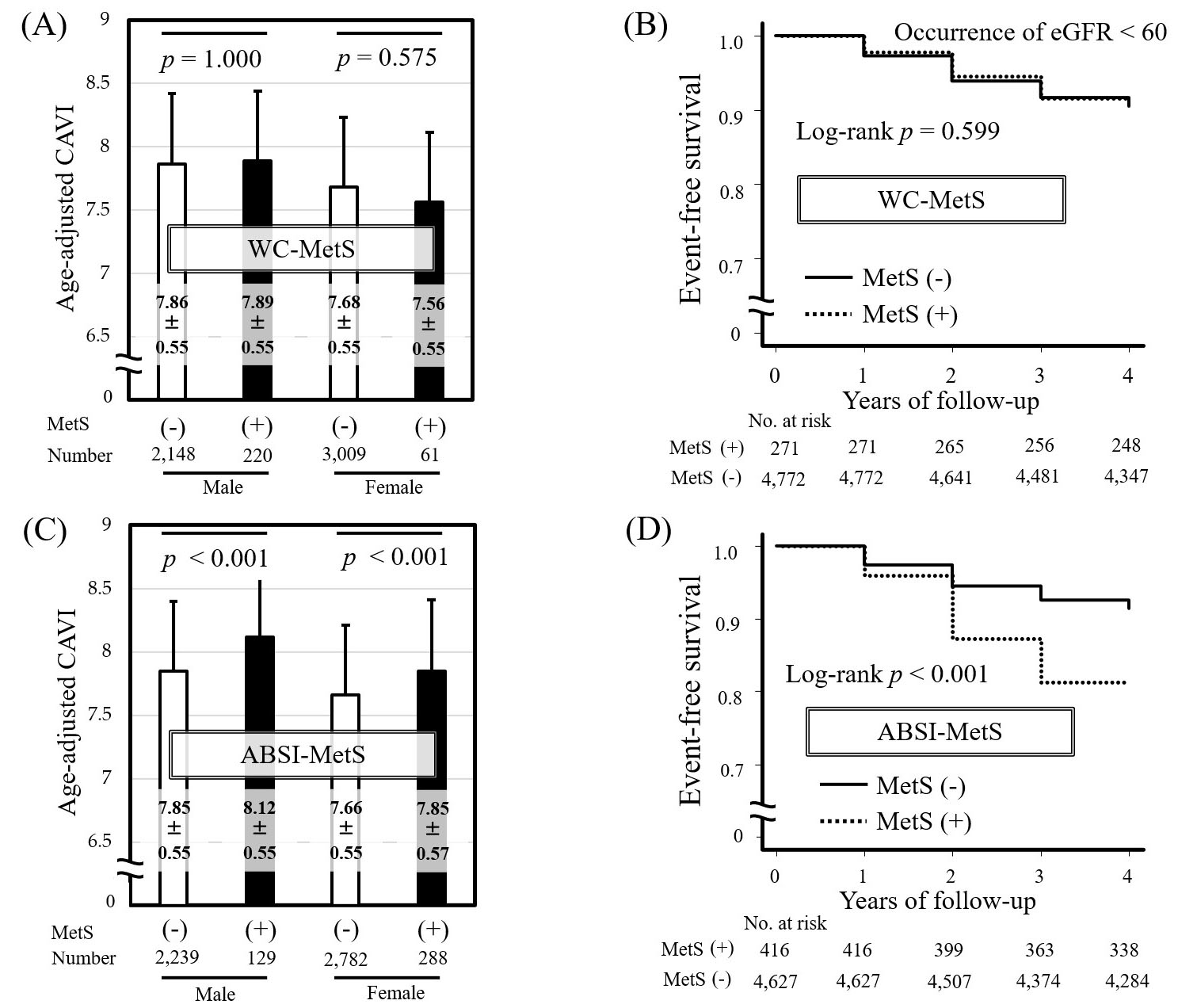 Individuals diagnosed with MetS using ABSI-MetS had significantly higher age-adjusted CAVI compared with non-MetS individuals (Fig. 3C), whereas no significant difference in age-adjusted CAVI was found between MetS and non-MetS individuals diagnosed using WC-MetS (Fig. 3A). The finding that individuals with MetS diagnosed using WC-MetS do not necessarily show high CAVI is consistent with the results of a large European multicenter study [45]. Similarly, replacing high WC with high ABSI in MetS diagnostic criteria has been shown to be useful for identifying individuals with relatively high CAVI in studies of Japanese workers [51] and in the general Korean population [46]. Furthermore, in our study, Kaplan-Meier analysis of new-onset kidney function decline (eGFR