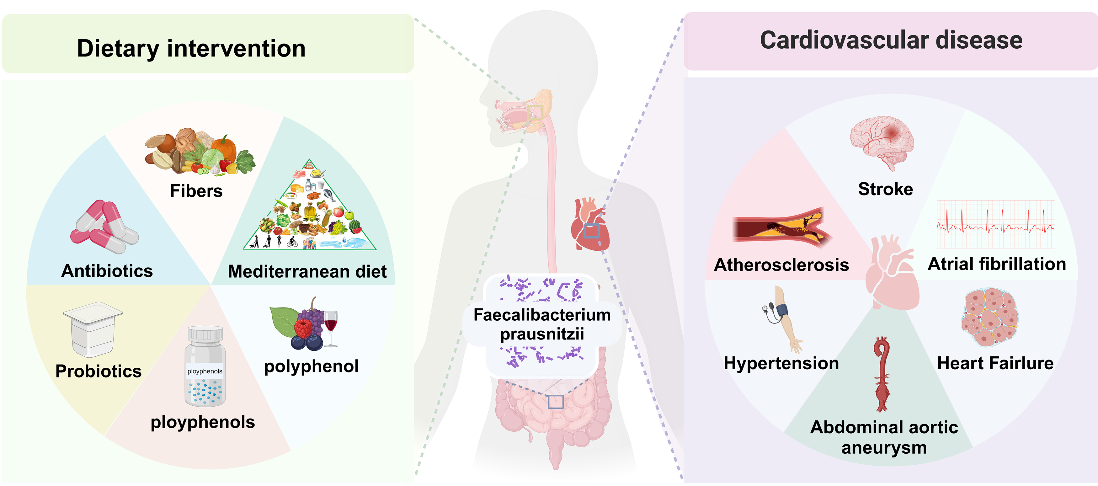 Fig. 1. Intervention factors and potential cardiovascular health of Faecalibacterium prausnitzii (F. prausnitzii) in the gut. By altering dietary patterns to include higher levels of fiber-rich foods, as well as probiotics and prebiotics, it is possible to enhance the abundance of intestinal F. prausnitzii bacteria. This modification may contribute to a reduced risk of various cardiovascular diseases (CVDs), including atherosclerosis (AS), stroke, heart failure (HF), atrial fibrillation (AF), and hypertension (HTN).