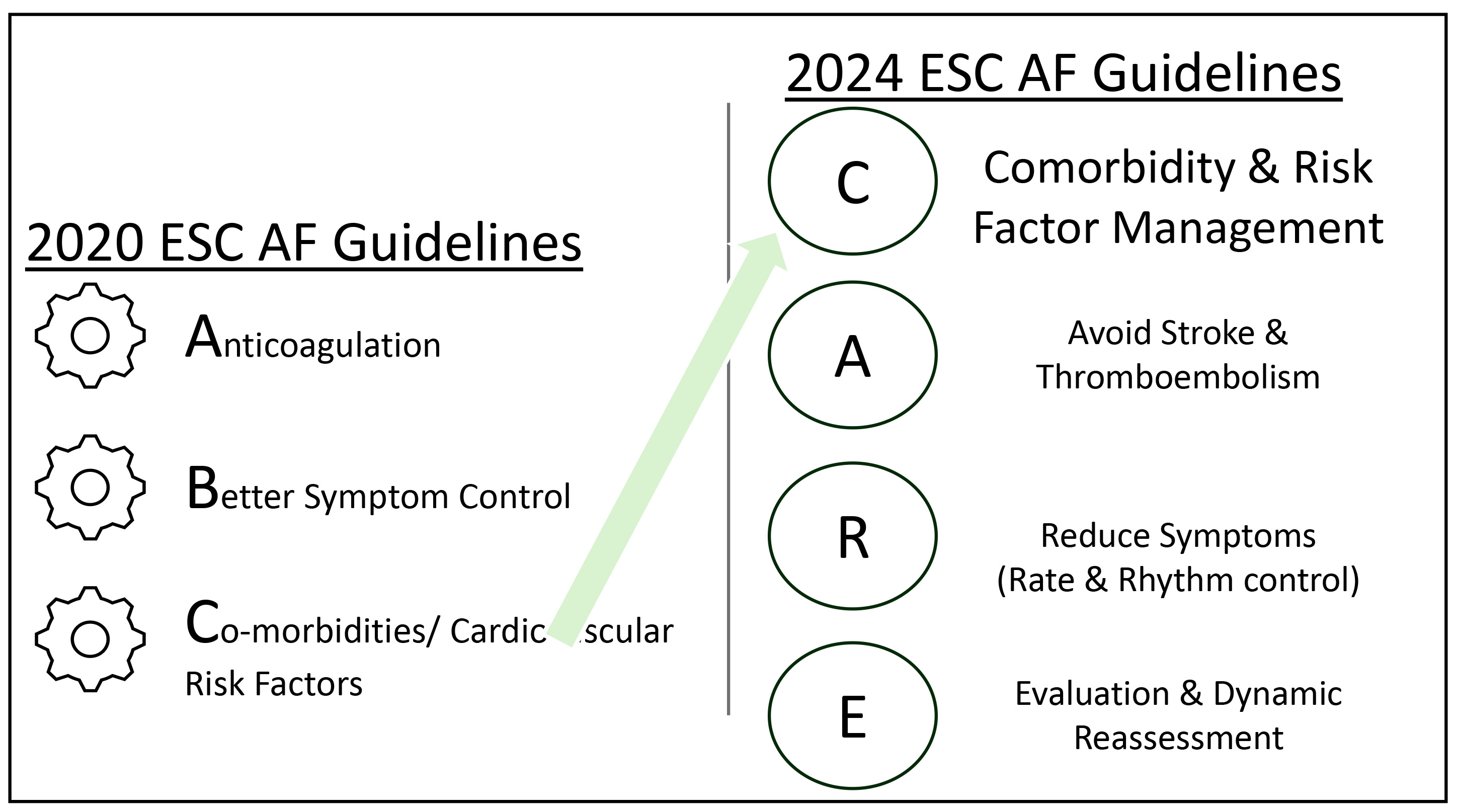 Fig. 1. The change in approach to atrial fibrillation management, as demonstrated in the 2024 ESC AF guideline update with prioritization of co-morbidities and AF risk factor management (adapted from the ESC 2024 Guidelines [7]). AF, atrial fibrillation; ESC, European Society of Cardiology.