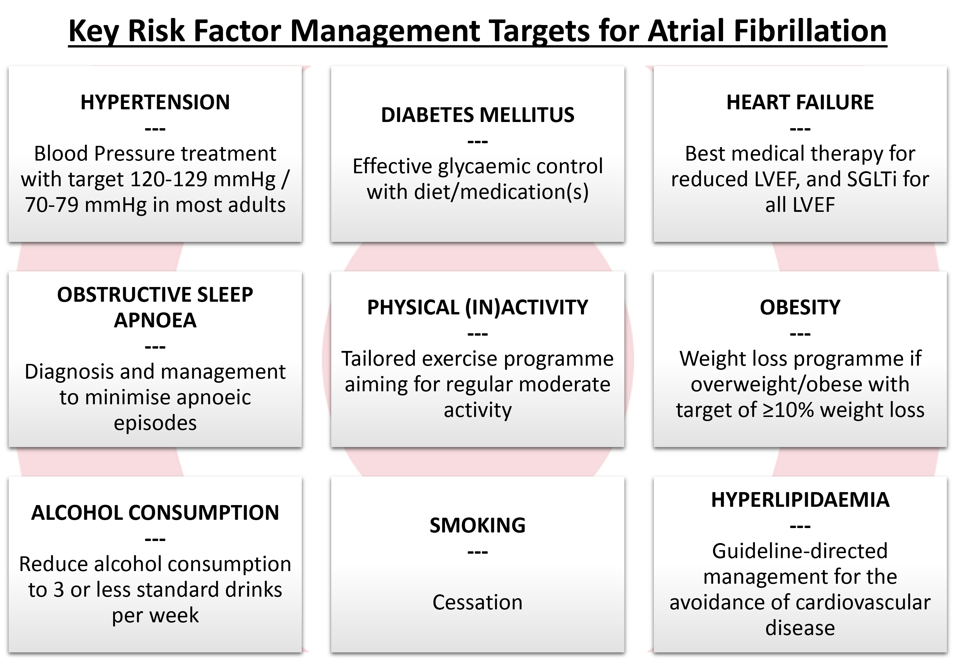 Fig. 2. Key risk factors for atrial fibrillation and their management targets (adapted from ESC 2024 AF Guidelines [7]). LVEF, left ventricular ejection fraction; SGLTi, sodium-glucose co-transporter 2 inhibitor; AF, atrial fibrillation; ESC, European Society of Cardiology.