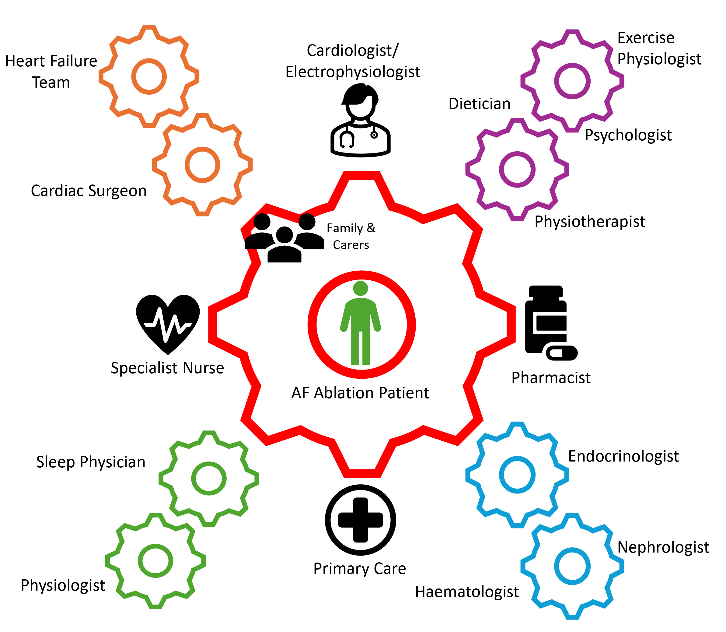 Fig. 3. Demonstration of the multi-disciplinary team ‘hub-and-spoke’ approach to the management of patients undergoing an AF ablation procedure. AF, atrial fibrillation.