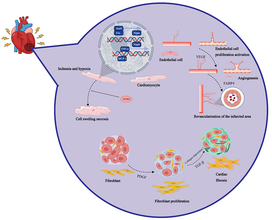 Fig. 1. After myocardial infarction, the cardiac injury repair process is a complex multi-stage pathophysiological process involving inflammation, neovascularization, and myocardial regeneration. Nppa, natriuretic peptide A; SUMO1, small ubiquitin-like modifier 1; VEGF, vascular endothelial growth factor; FABP4, fatty acid binding protein 4; TGF-