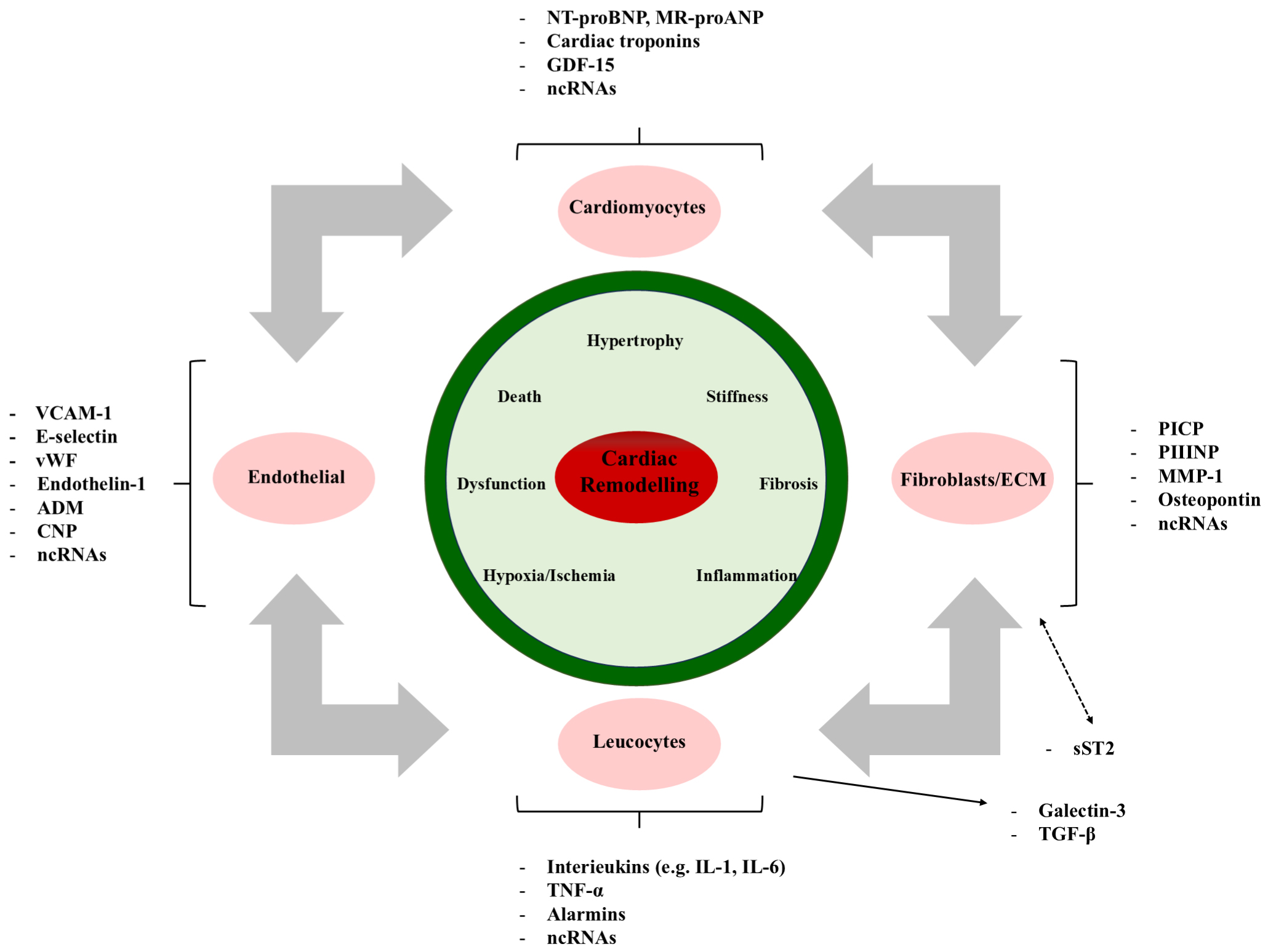 Fig. 2. The molecular mechanisms of cardiac remodeling involve various pathophysiological stimuli. VCAM-1, vascular cell adhesion molecule-1; ADM, adrenomedullin; CNP, C-type natriuretic peptide; BNP, B-type natriuretic peptide; GDF-15, growth differentiation factor 15; EVs, extracellular vesicles; PIIINP, procollagen III N-terminal propeptide; MMP-1, matrix metalloproteinase-1; TNF-