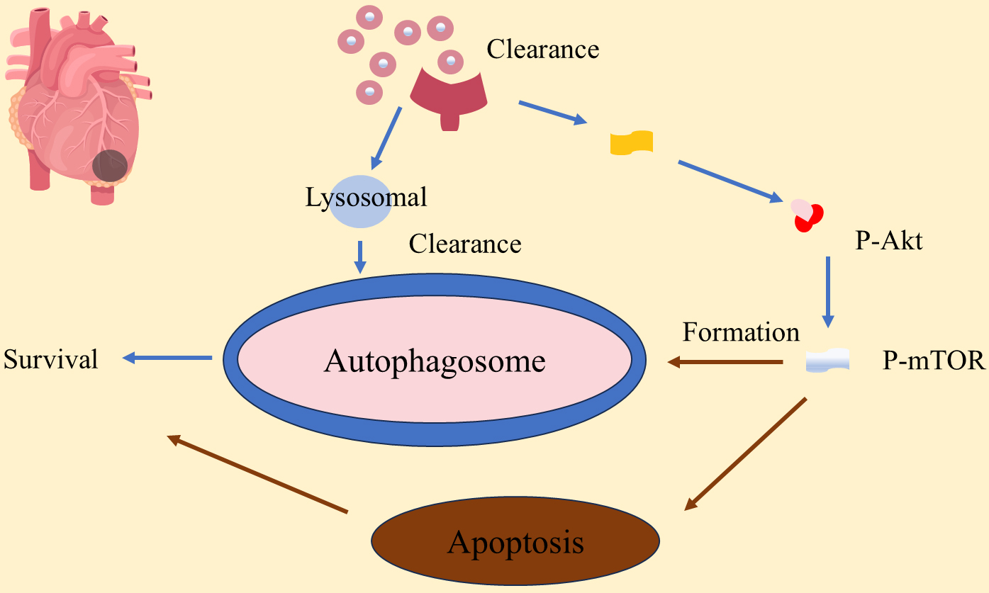 Fig. 3. Autophagy plays a role in myocardial remodeling in myocardial infarction. P-AKT, phosphorylated protein kinase B; P-mTOR, phosphorylated mammalian target of rapamycin.