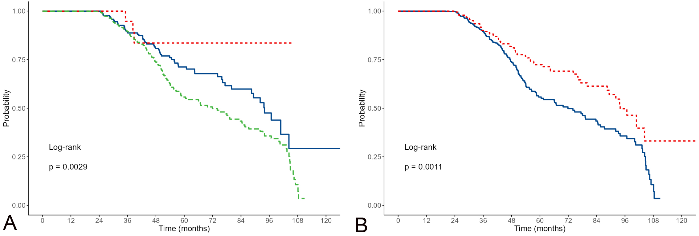 As the next step, we applied the Kaplan-Meier method (Fig. 2) to nominal or ordinal variables that showed statistical significance in the previous table. The results are presented in the graphs below.