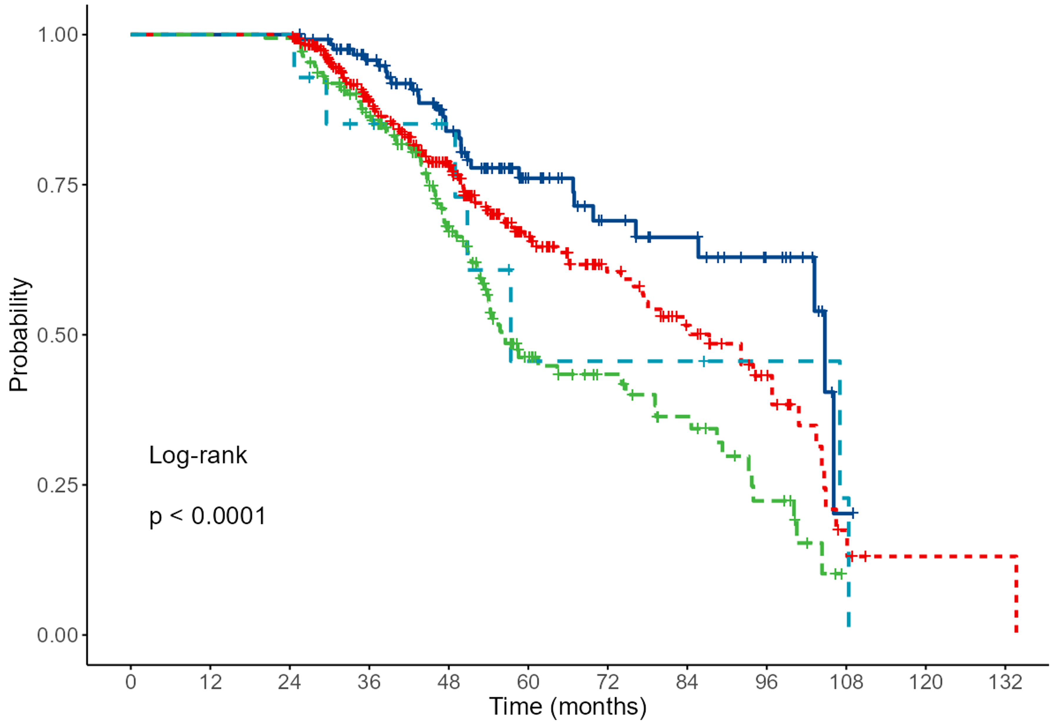 Fig. 2. Results of Kaplan-Meier analysis for NYHA. Grade 1 (dark blue), 2 (red), 3 (green) and 4 light blue (p