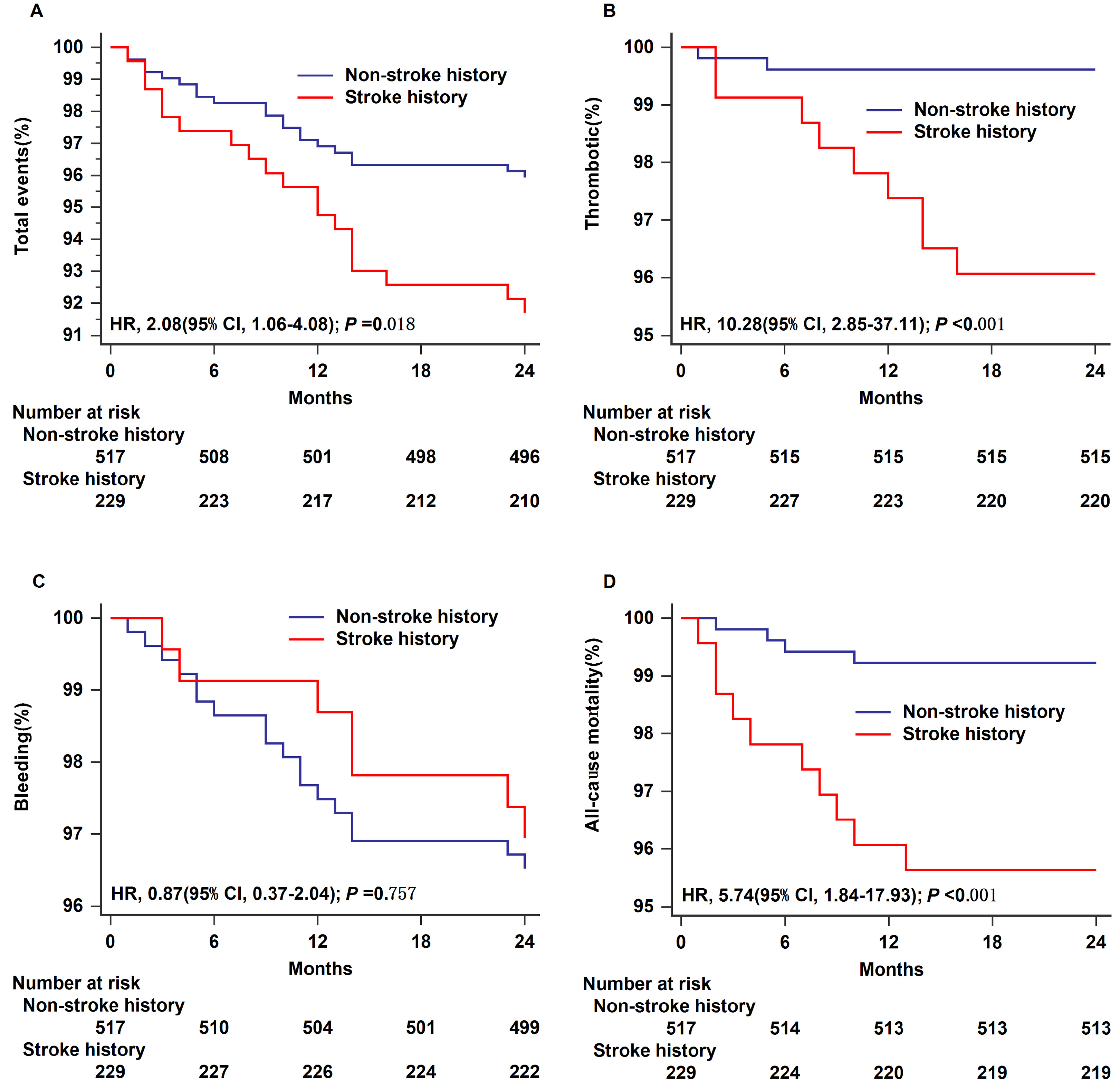 The Kaplan–Meier survival curves for each type of postoperative endpoint event in the two groups are shown in Fig. 1. The log-rank test was used to compare the Kaplan–Meier estimate curves for total events, thrombotic events, bleeding events, and all-cause mortality in the analysis. Compared with the non-stroke history group, the stroke history group experienced a higher incidence of total adverse events (HR = 2.08, 95% CI 1.06–4.08, log-rank p = 0.018; Fig. 1A), a greater number of thrombotic events (HR = 10.28, 95% CI 2.85–37.11, log-rank p