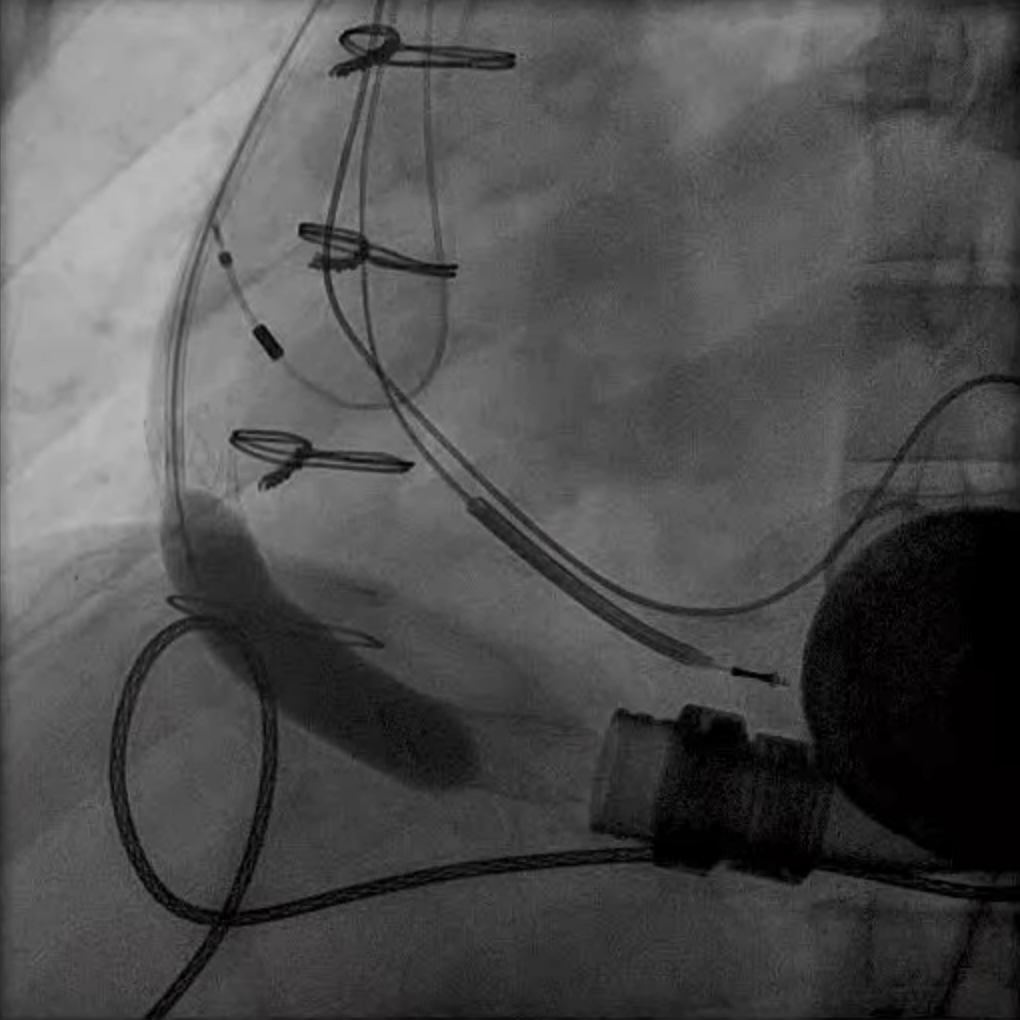 Fig. 11. Catheter based thrombolytics in pump thrombosis. Pigtail catheter placed in the LV close to the LVAD inflow and thrombolytic infusion over a period of 24 hours. LV, left ventricle.