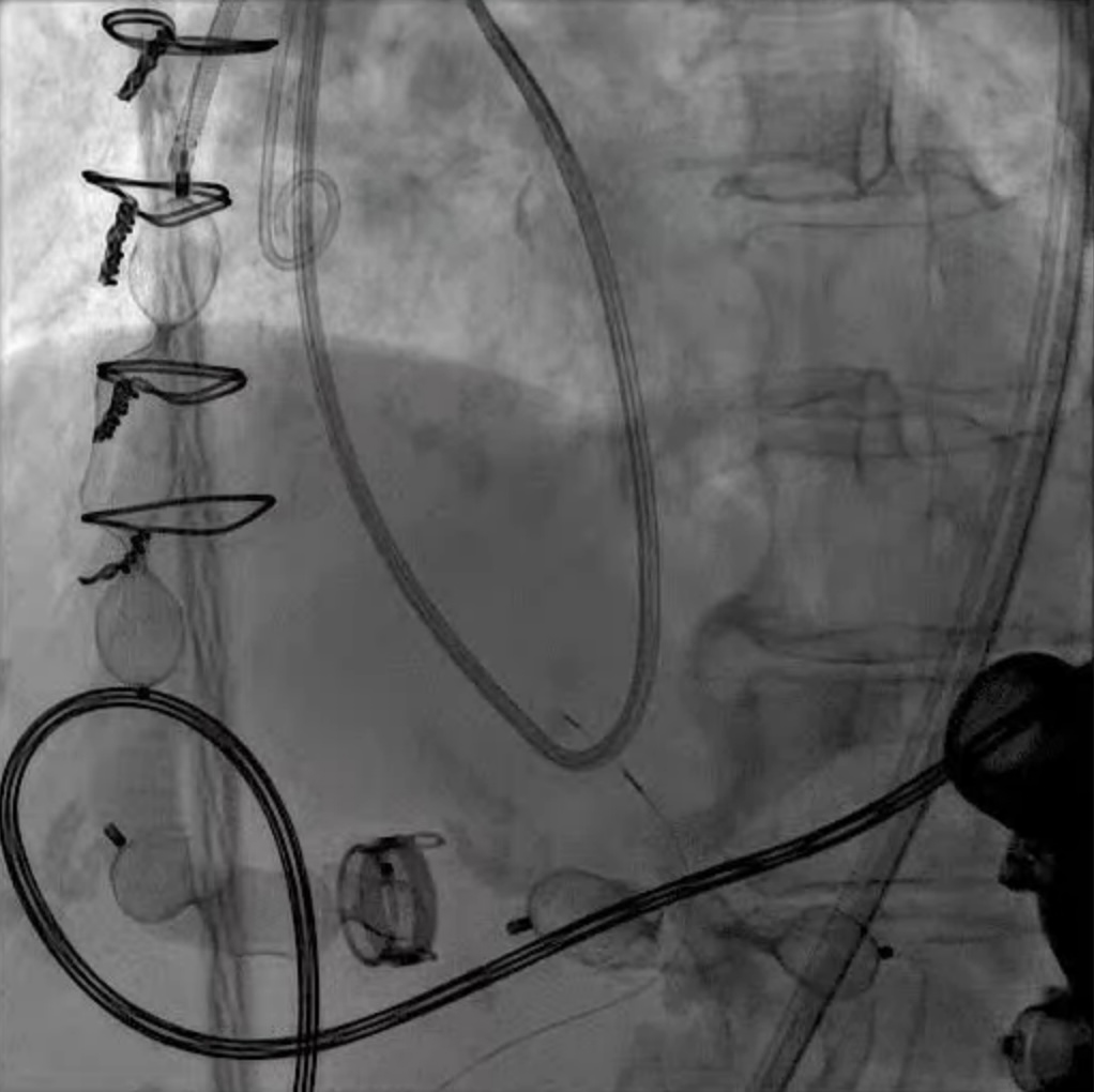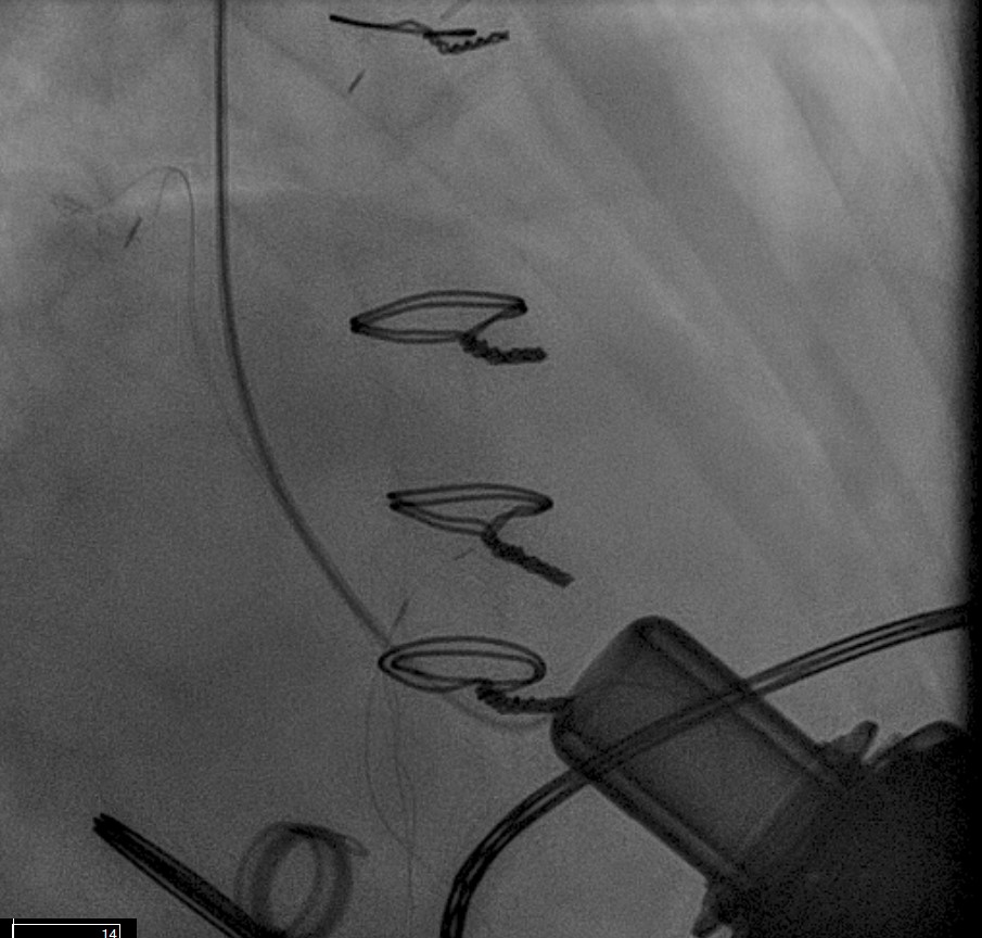 Fig. 12. LVAD decommissioning. Outflow cannula occlusion with a series of three large Amplatzer vascular plug 2 (AVP2) from the proximal end to the distal end of the cannula.