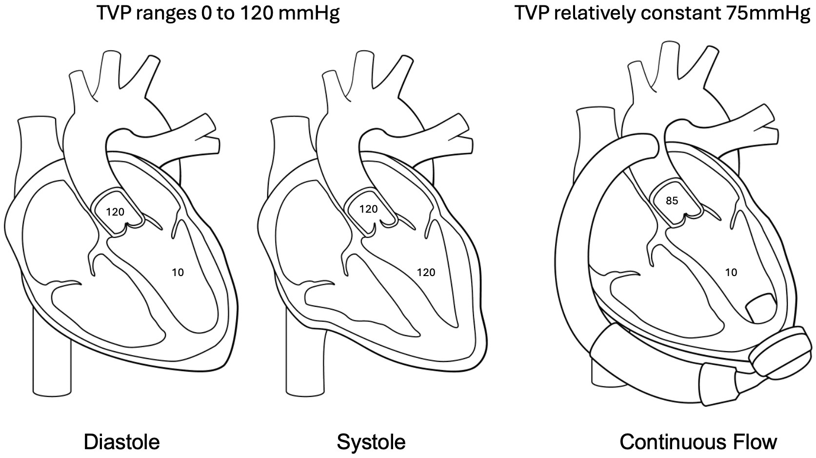 Fig. 2. Pathophysiology of aortic regurgitation post LVAD. In native circulation the transvalvular pressure (TVP) ranges from zero to peak systolic aortic pressure allowing a time of minimal stress on the aortic valve leaflets. In continuous flow circulation the TVP remains relatively constant thus creating an increased hemodynamic stress on valve leaflets contributing to the development of aortic regurgitation (AR) post LVAD.