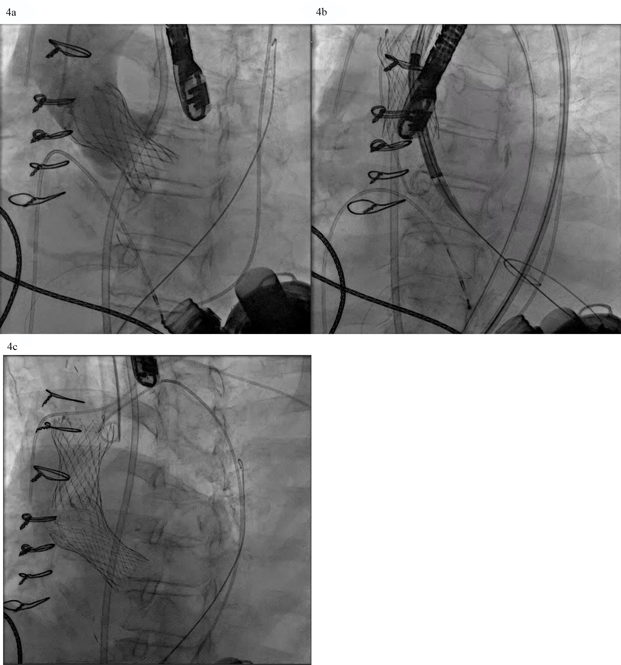 Fig. 4. AVR with a self-expanding valve (Medtronic) in LVAD complicated by migration. (a) Medtronic Evolut valve deployed too deep in the ventricle. (b) Evolut valve embolized to the aorta when attempting to reposition the valve with a snare. (c) Second Evolut valve successfully placed across the aortic valve.