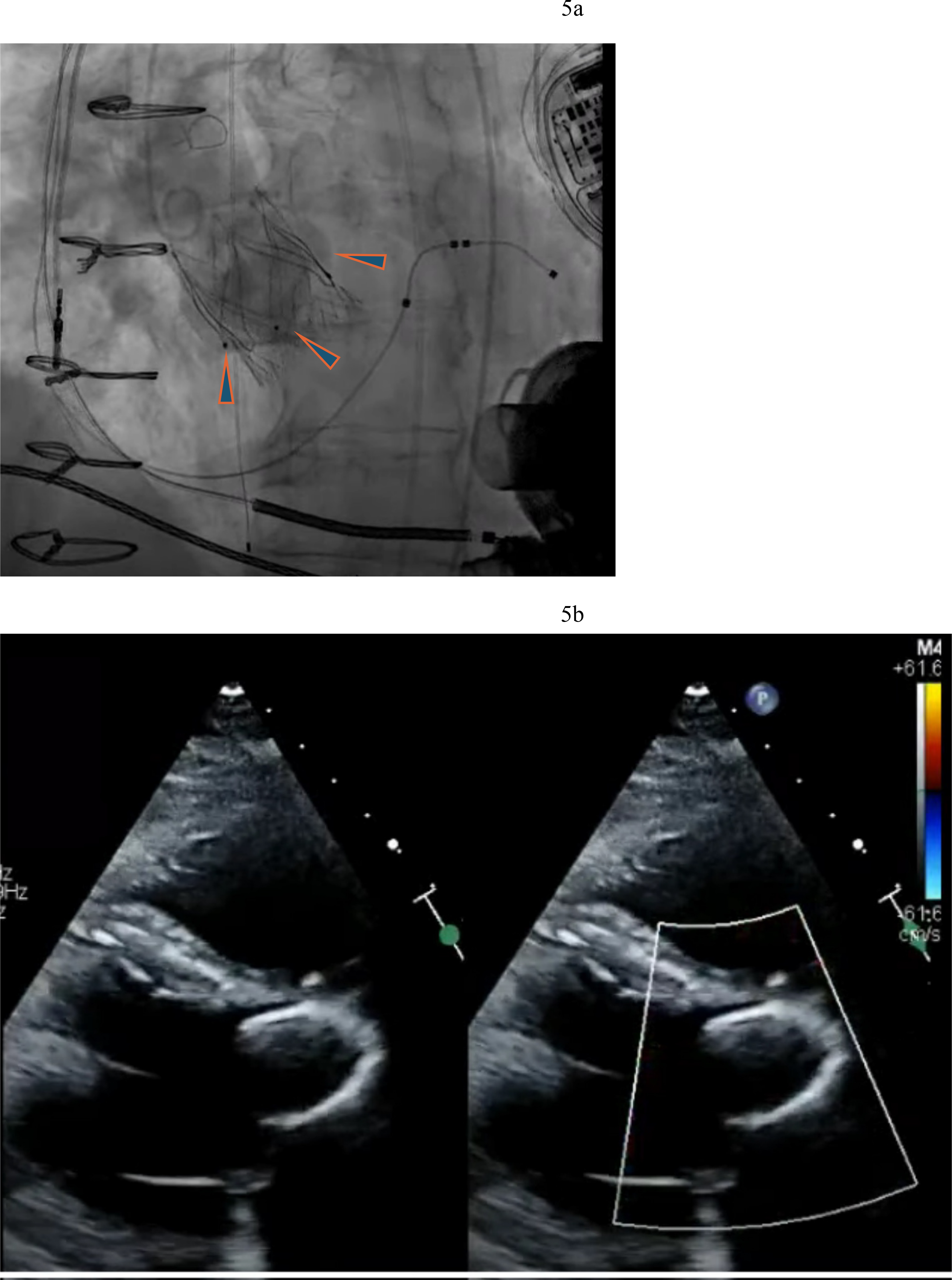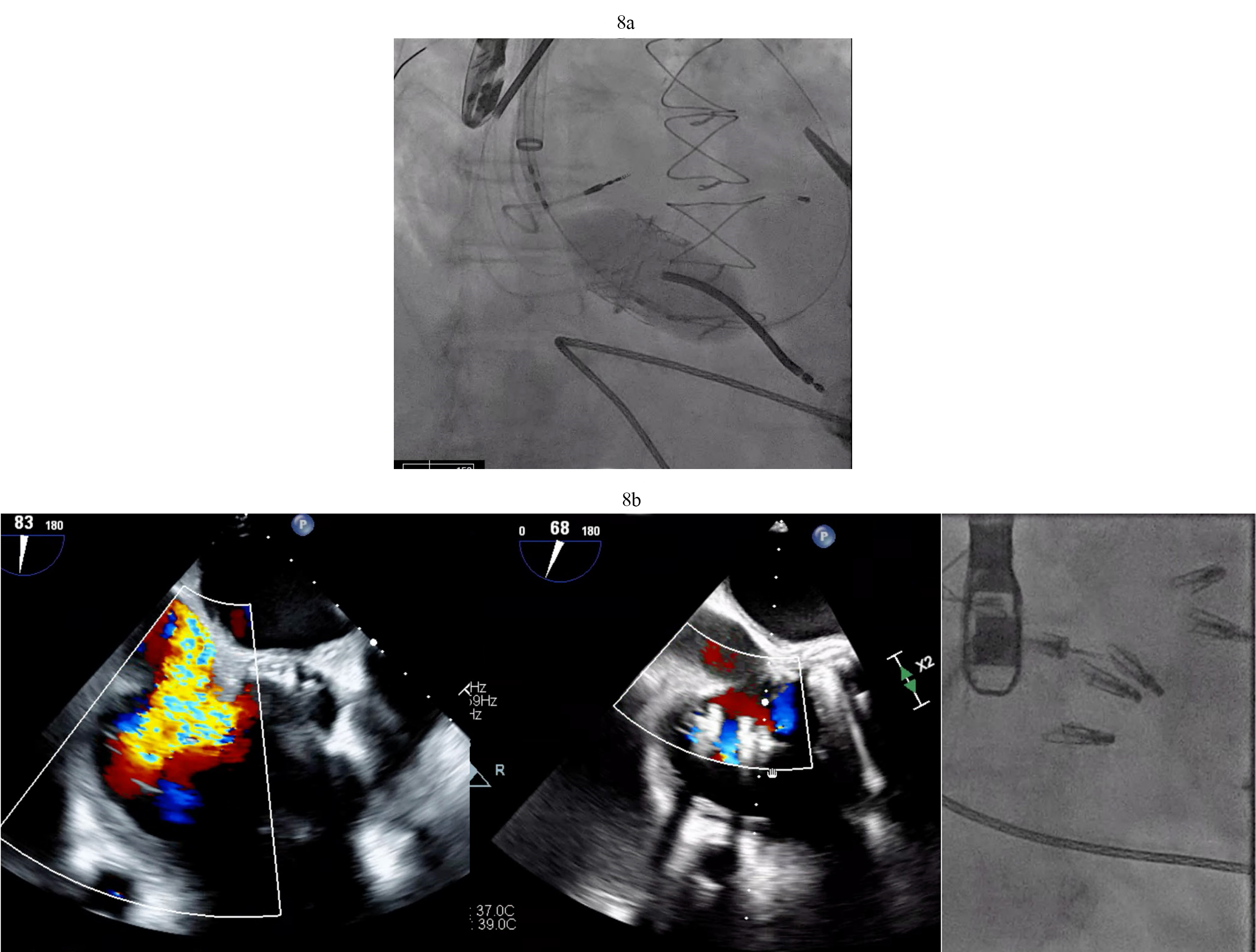 Fig. 8. Tricuspid valve valve-in-ring TTVR in LVAD patient. (a) Sapien 3 valve being deployed in a TV annuloplasty band for treatment of severe TR via trans jugular approach. (b) T-TEER with Triclip. Torrential to mild TR after three Triclips. (Two previously placed Mitraclips are also visible on the fluoroscopy image). T-TEER, tricuspid transcatheter edge to edge repair; TV, tricuspid valve; TR, tricuspid regurgitation.