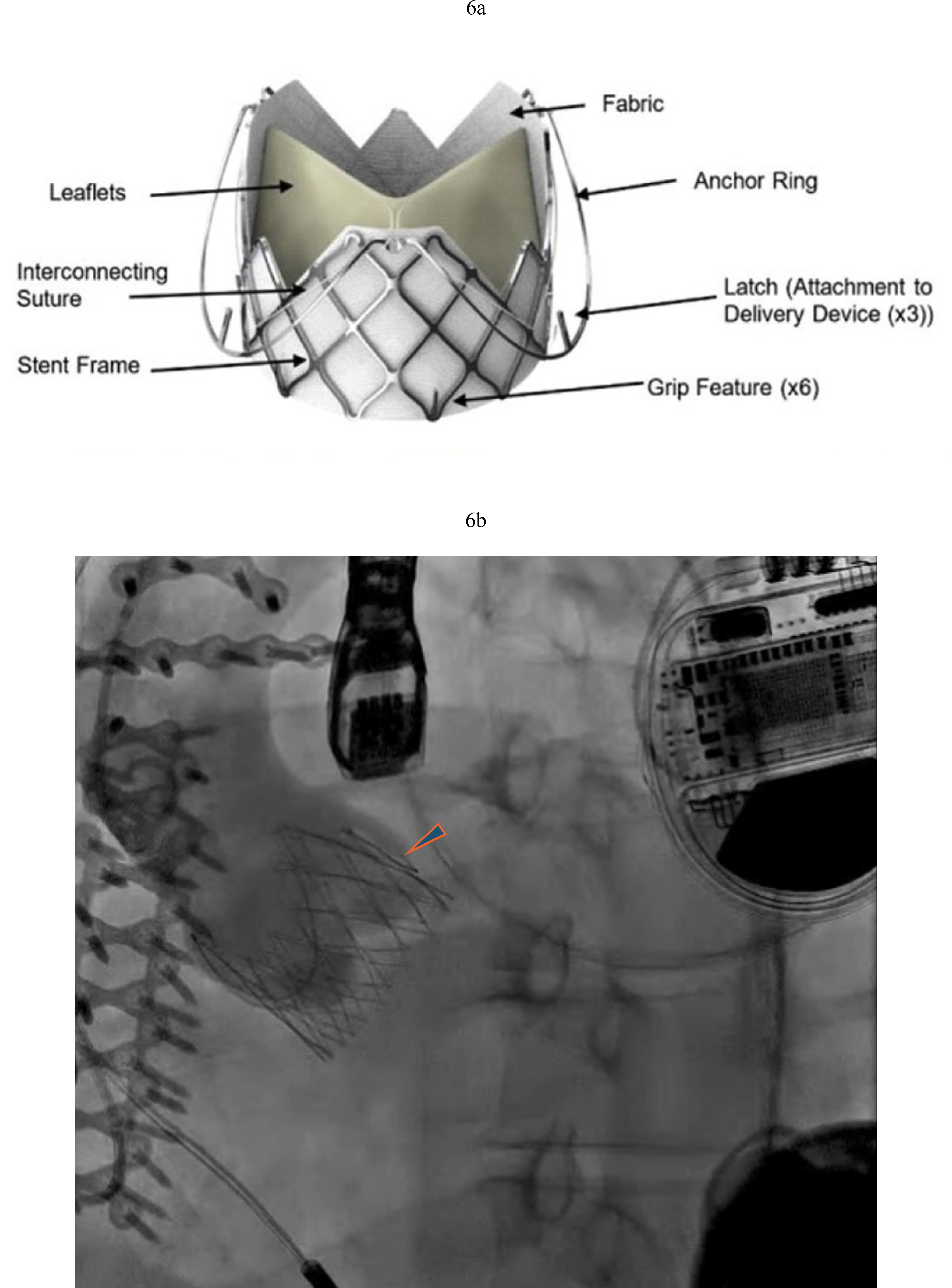 Fig. 6. J Valve TAVR in LVAD patient with severe AR. (a) J-Valve with three anchor rings that secure in the aortic cusps. (b) J Valve implantation with resolution of AR (arrowhead pointing to anchor ring).