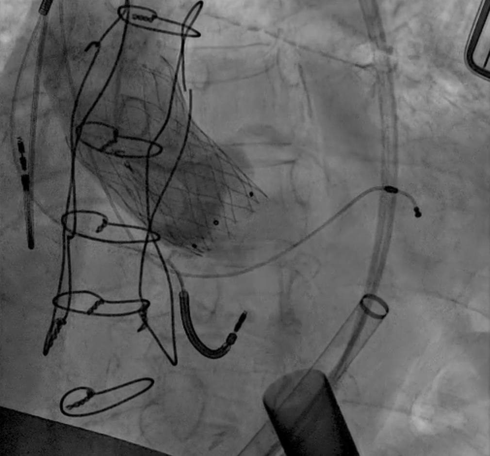 Fig. 7. Abbott Navitor TAVR in LVAD patient. Abbott Navitor valve with large outflow diameter and anchoring in the ascending aorta for AR.