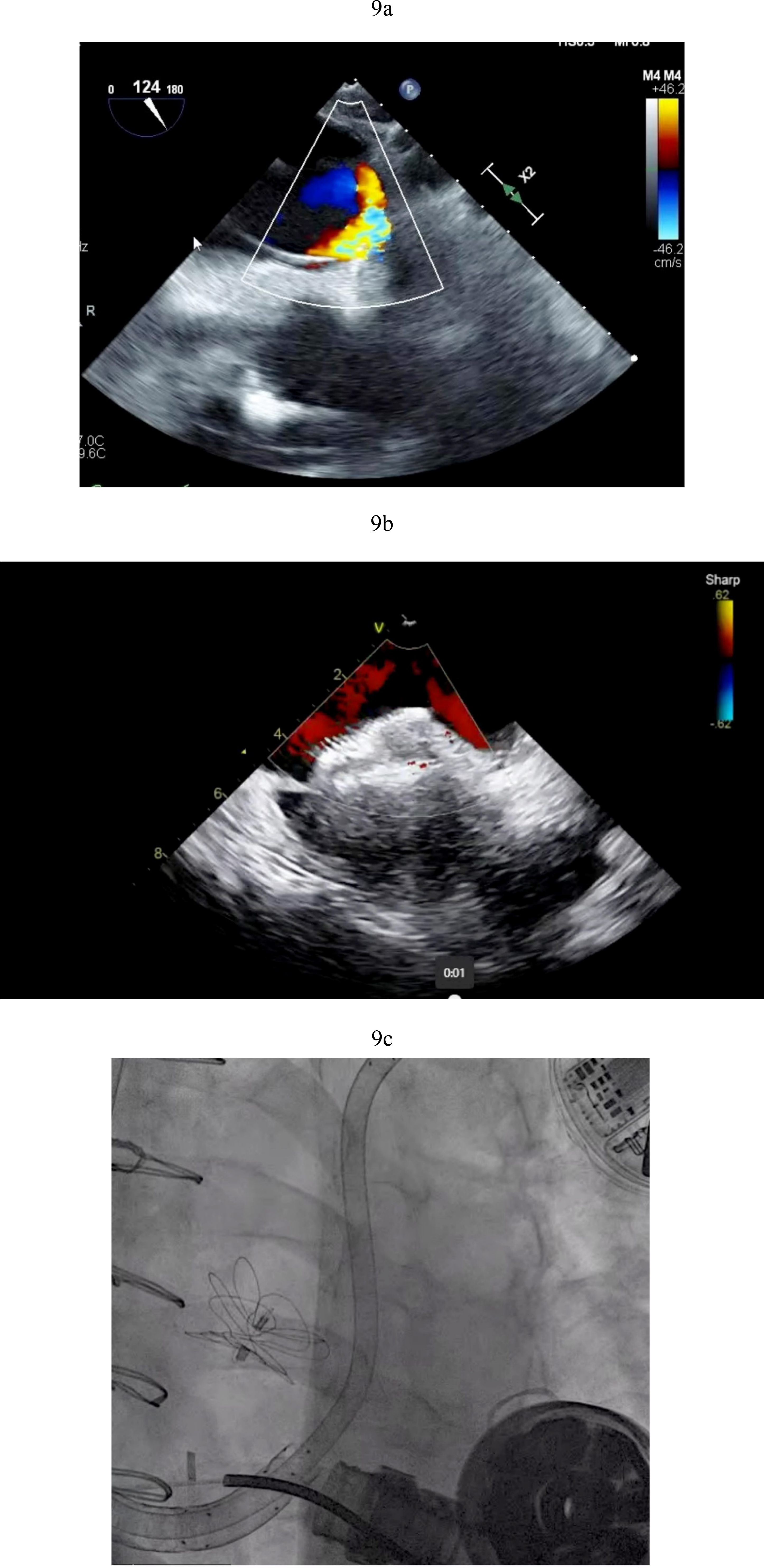 Fig. 3. Amplatzer closure of aortic valve. (a) Amplatzer septal occluder across native aortic valve. (b) TEE showing the two discs of the Amplatzer device closing the aortic valve. (c) Aortic regurgitation resolved after Amplatzer closure. TEE, transesophageal echocardiogram.