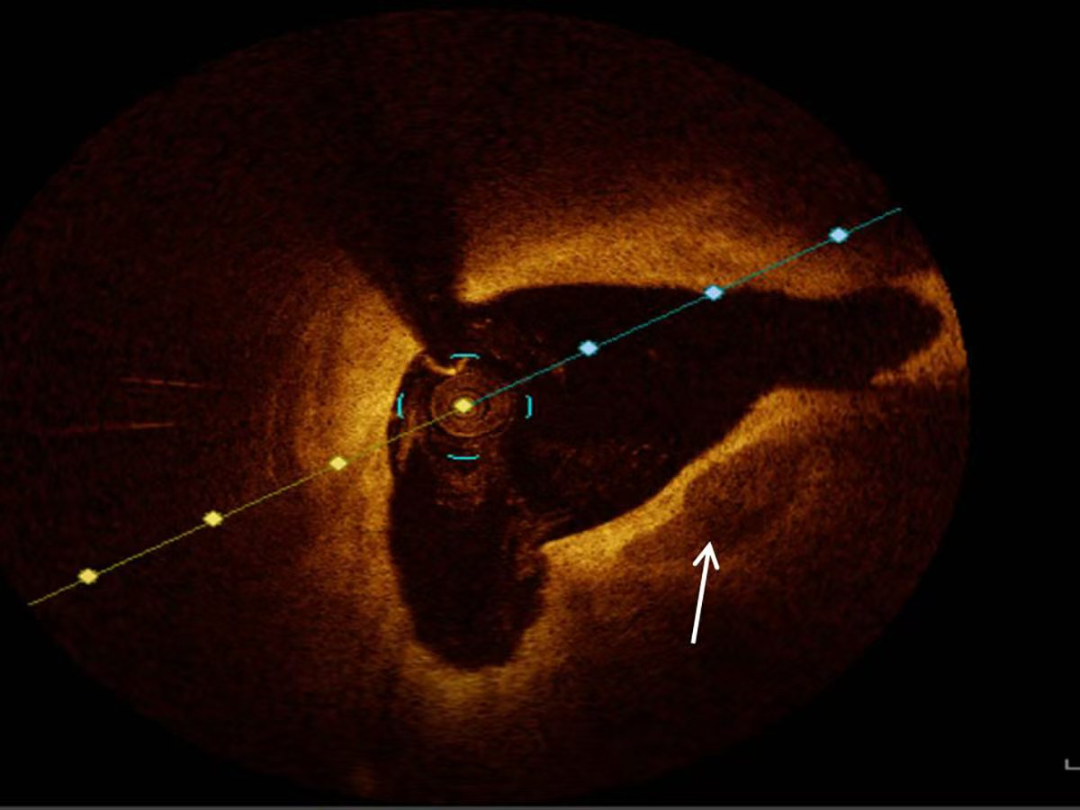Fig. 1. Representative optical coherence tomography image of calcification (white arrow).
