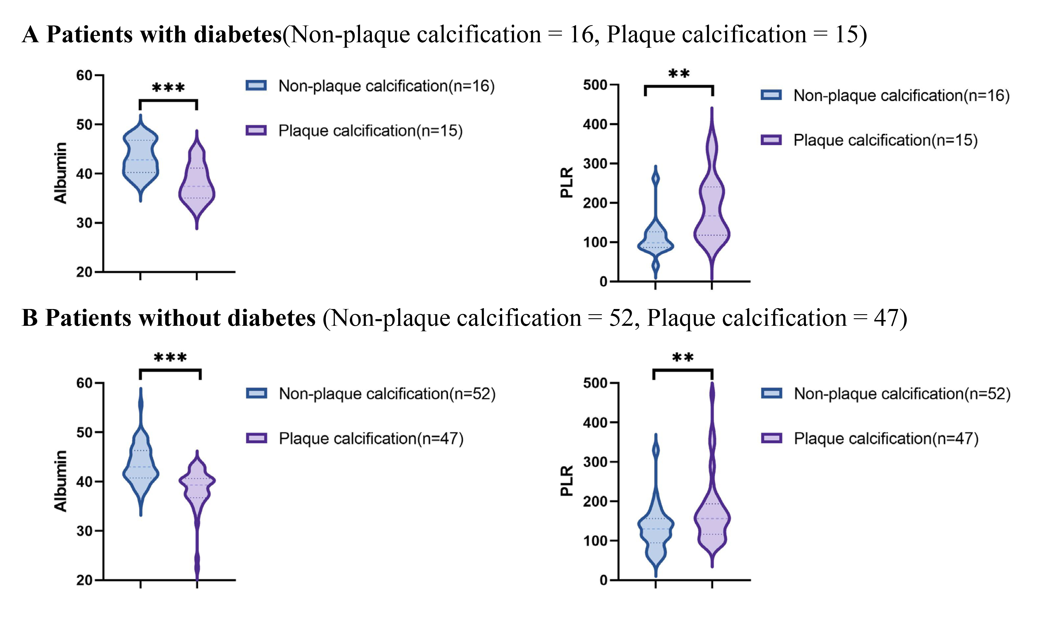Fig. 2. Relationship between the PLR and albumin and coronary plaque calcification in patients with or without diabetes. PLR, platelet to lymphocyte ratio; ** p
