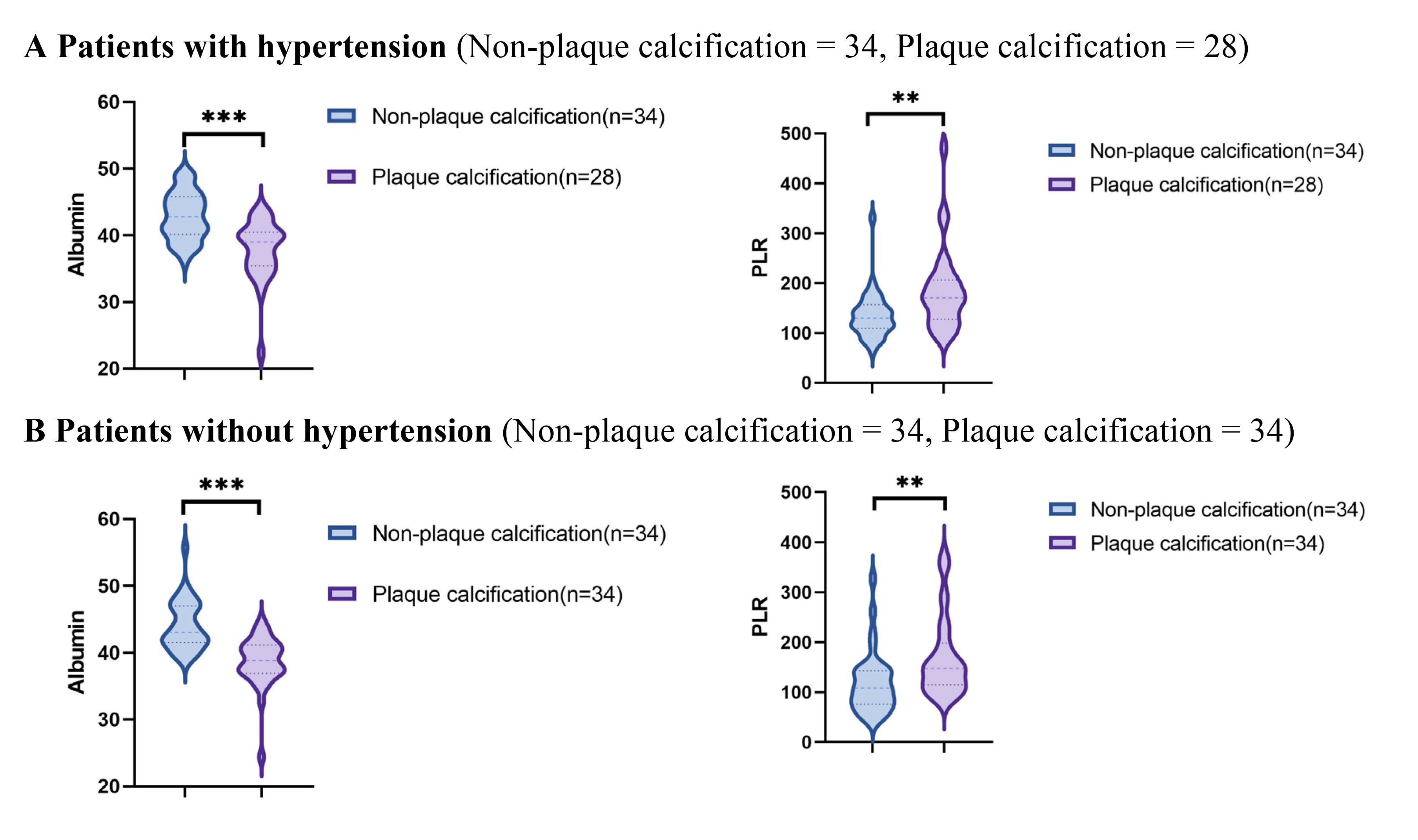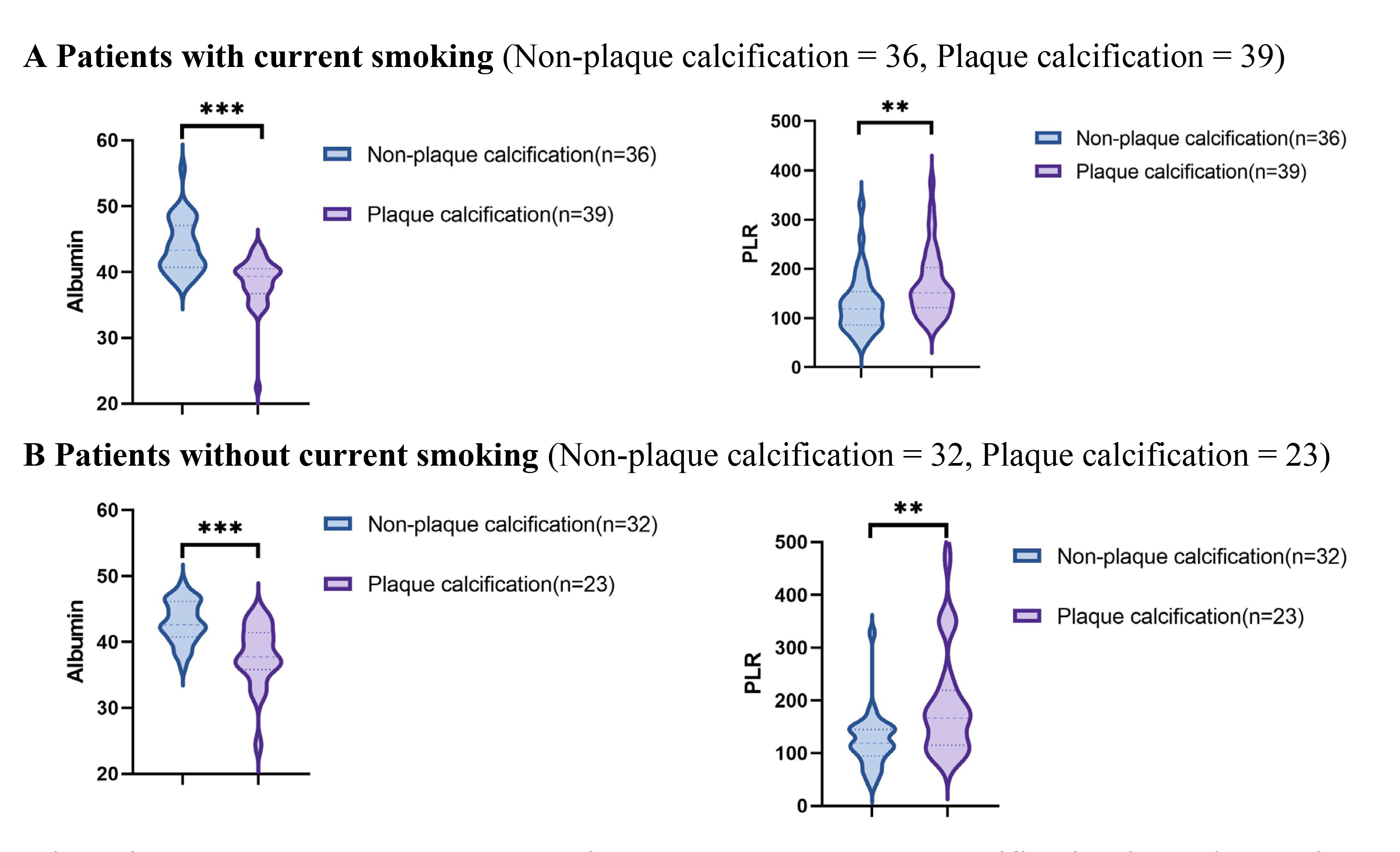 Using data from the presence or absence of plaque calcification along with traditional risk factors such as hypertension, diabetes, hyperlipidemia, and current smoking status, the study population was stratified into distinct subgroups to facilitate a comparison of the PLR and albumin levels between the plaque calcification and non-plaque calcification groups. As illustrated in Figs. 2,3,4,5, the non-plaque calcification group, across various subgroups, exhibited significantly higher levels of albumin in comparison to the plaque calcification group, while the PLR was markedly lower in the non-plaque calcification group than in the plaque calcification group (p