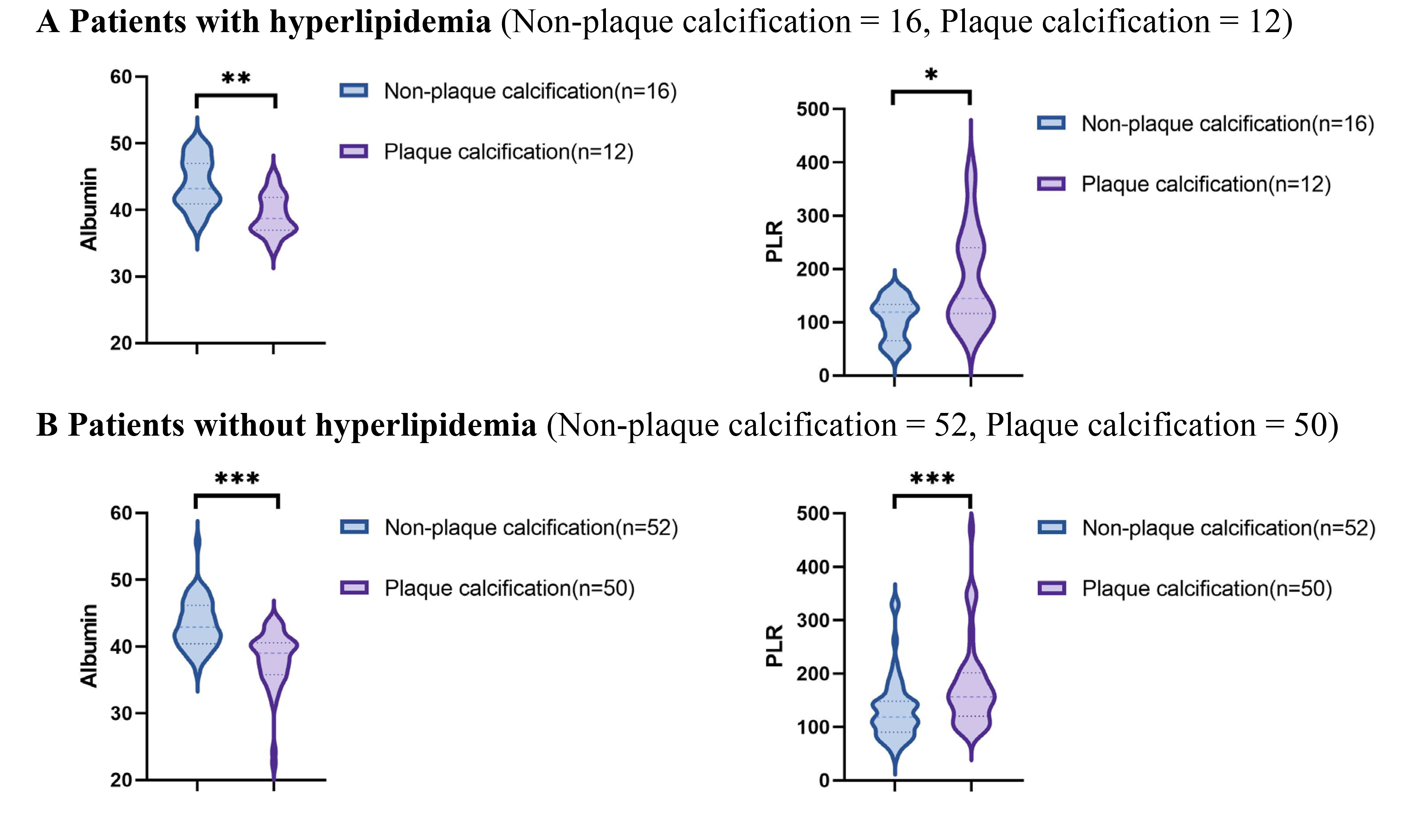 This study found that, independent of traditional risk factors for plaque calcification—such as hypertension, diabetes, hyperlipidemia, and current smoking status—albumin levels in the non-plaque calcification group were significantly higher than those in the plaque calcification group, whereas the PLR was significantly lower in the latter group. Furthermore, albumin levels demonstrated a significant negative correlation with coronary artery plaque calcification in ACS patients, whereas PLR exhibited a positive correlation. Notably, both factors emerged as independent predictors of coronary artery plaque calcification in this patient population.