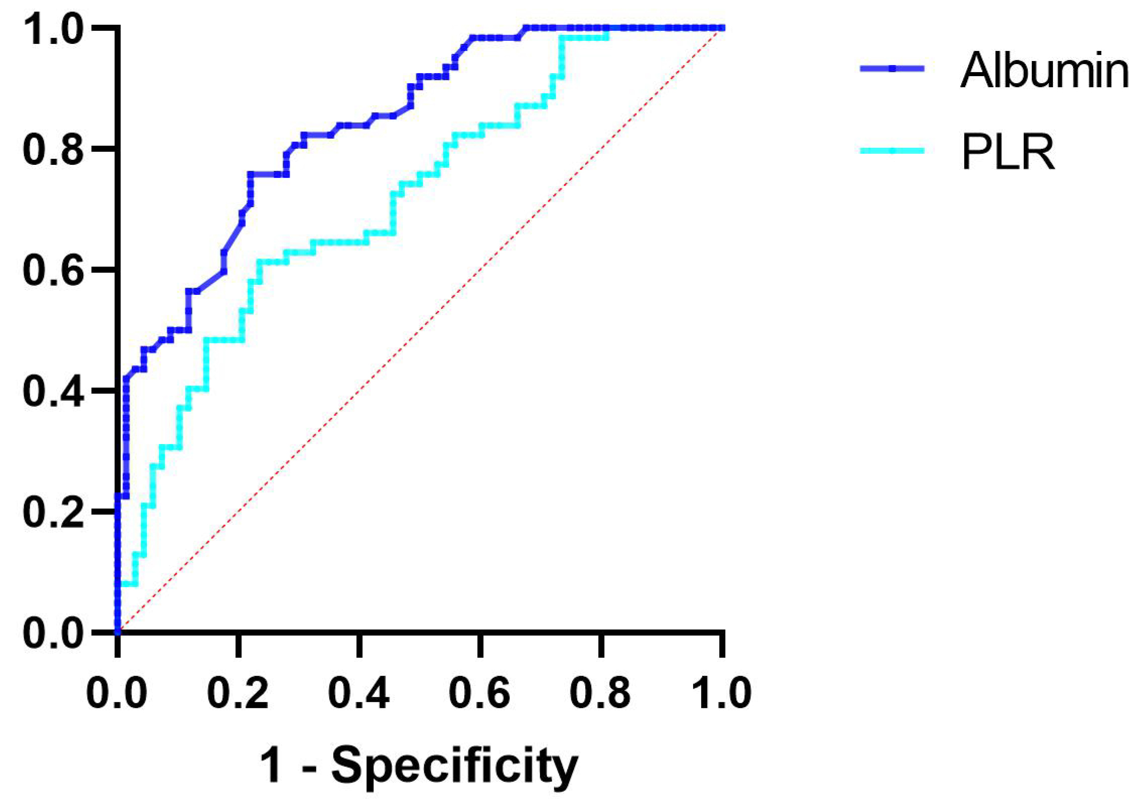 Fig. 6. ROC curve analysis evaluating the predictive ability of albumin and PLR for plaque calcification. The cutoff value of albumin associated with plaque calcification was albumin