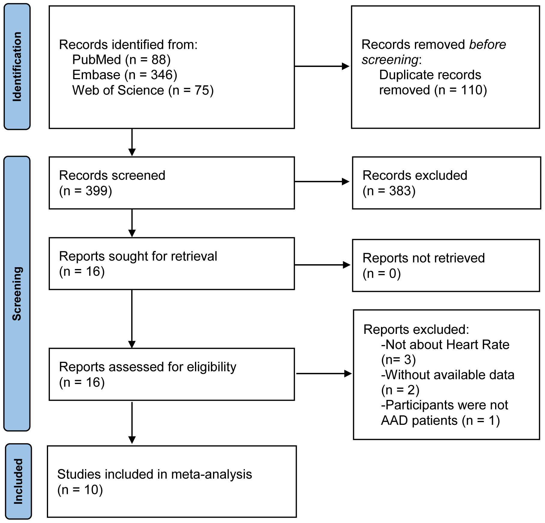 After the documents included in the analysis were determined, the data were extracted independently according to the pre-designed table. Each included study was carefully evaluated by two independent professionals, and the extracted data included the first author, basic characteristics of the research subjects (sample size, gender, and age), HR measurement time, categories of AAD, treatment methods, and research outcomes. After data extraction, the two authors exchanged audit extraction forms and discussed and solved any inconsistencies.