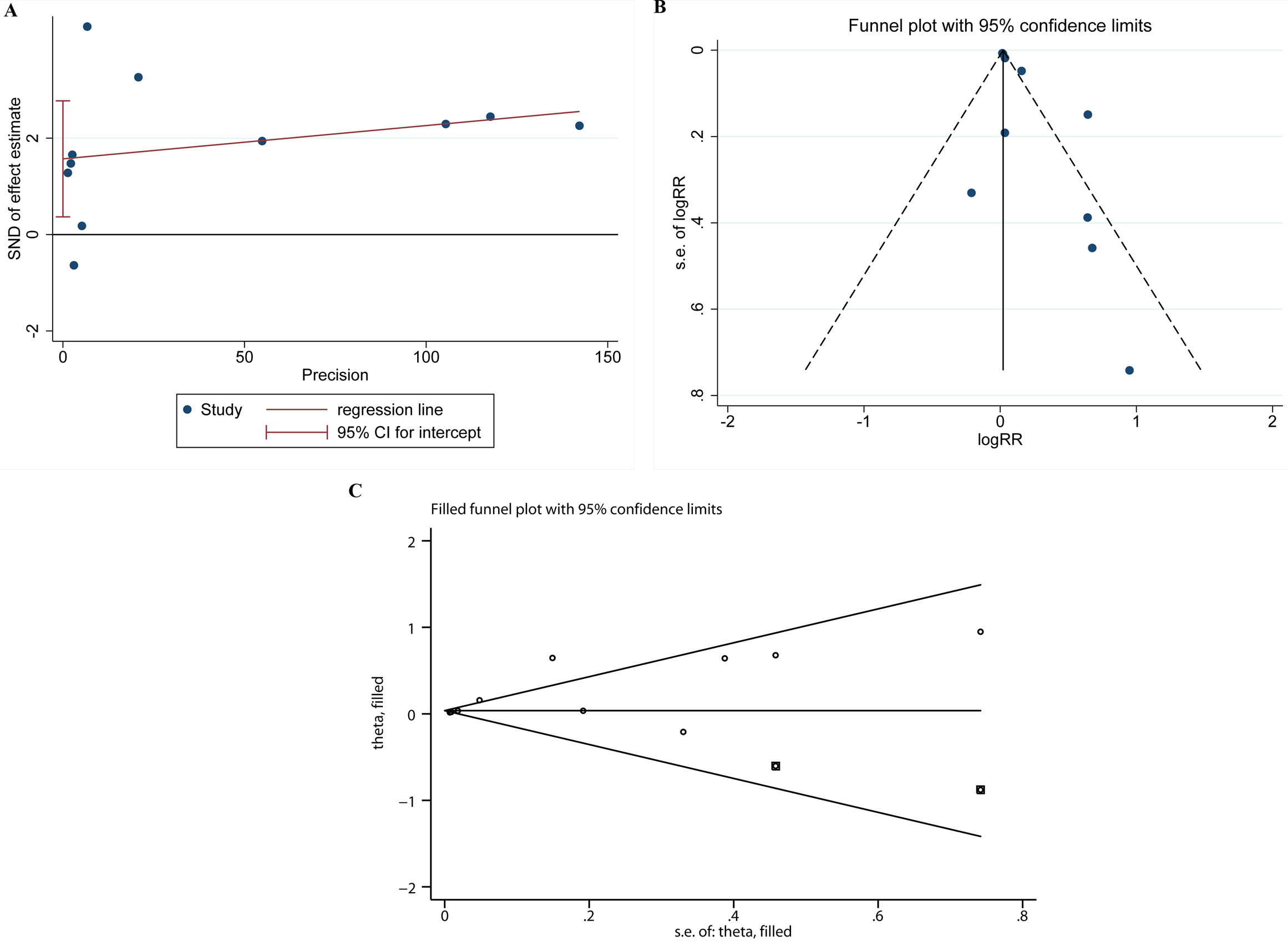 The publication bias test. Egger’s test (A), Egger’s funnel plot (B), and shear-fill method (C). SND, standard normal deviate.