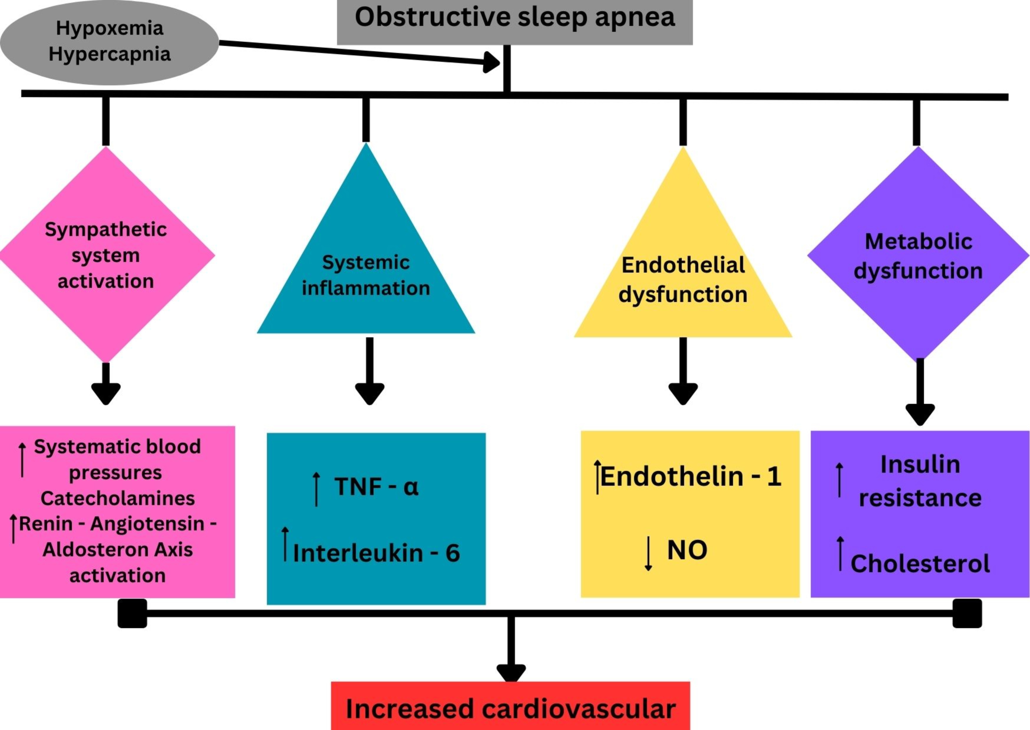 Hypoxemia is considered the primary factor that leads to cardiovascular damage [60]. OSA is linked to nocturnal hypoxemia, leading to increased sympathetic outflow, systemic inflammation, and oxidative stress, all of which can damage the cardiovascular system [61].