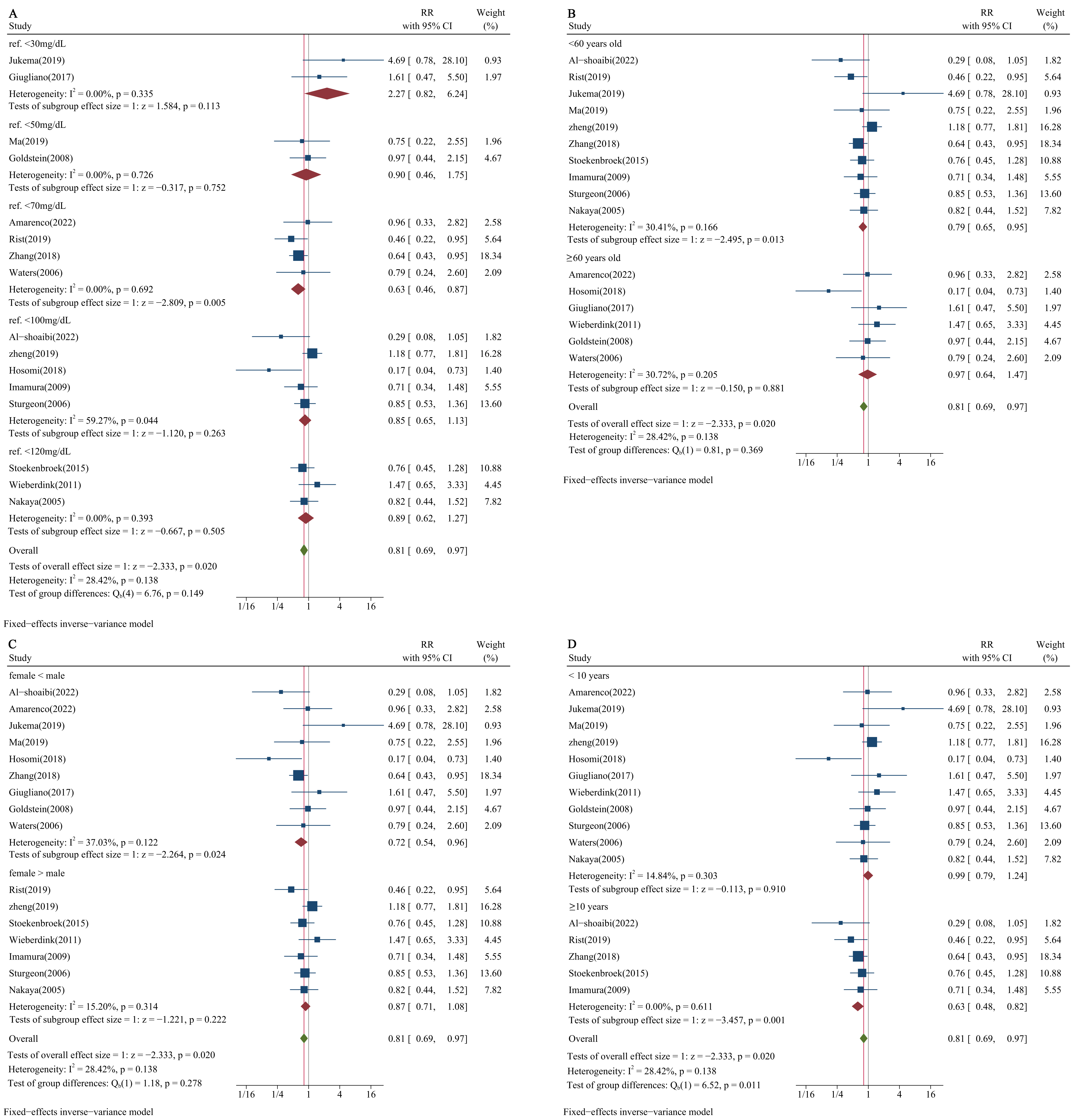 We also conducted subgroup analysis stratified by reference groups, age, proportion of sex, and follow-up time to find other potential factors affecting the relationship between LDL-C concentration and the risk of HS. The results presented a significant relationship between LDL-C concentration and risk of HS when the reference group was below 70 mg/dL (RR = 0.63, 95% CI: 0.46–0.87, p = 0.005; Fig. 3A), when age was below 60 years old (RR = 0.79, 95% CI: 0.65–0.95, p = 0.013; Fig. 3B), when the proportion of females was less than males (RR = 0.72, 95% CI: 0.54–0.96, p = 0.024; Fig. 3C), and when follow-up time was more than 10 years (RR = 0.63, 95% CI: 0.48–0.82, p = 0.001; Fig. 3D).