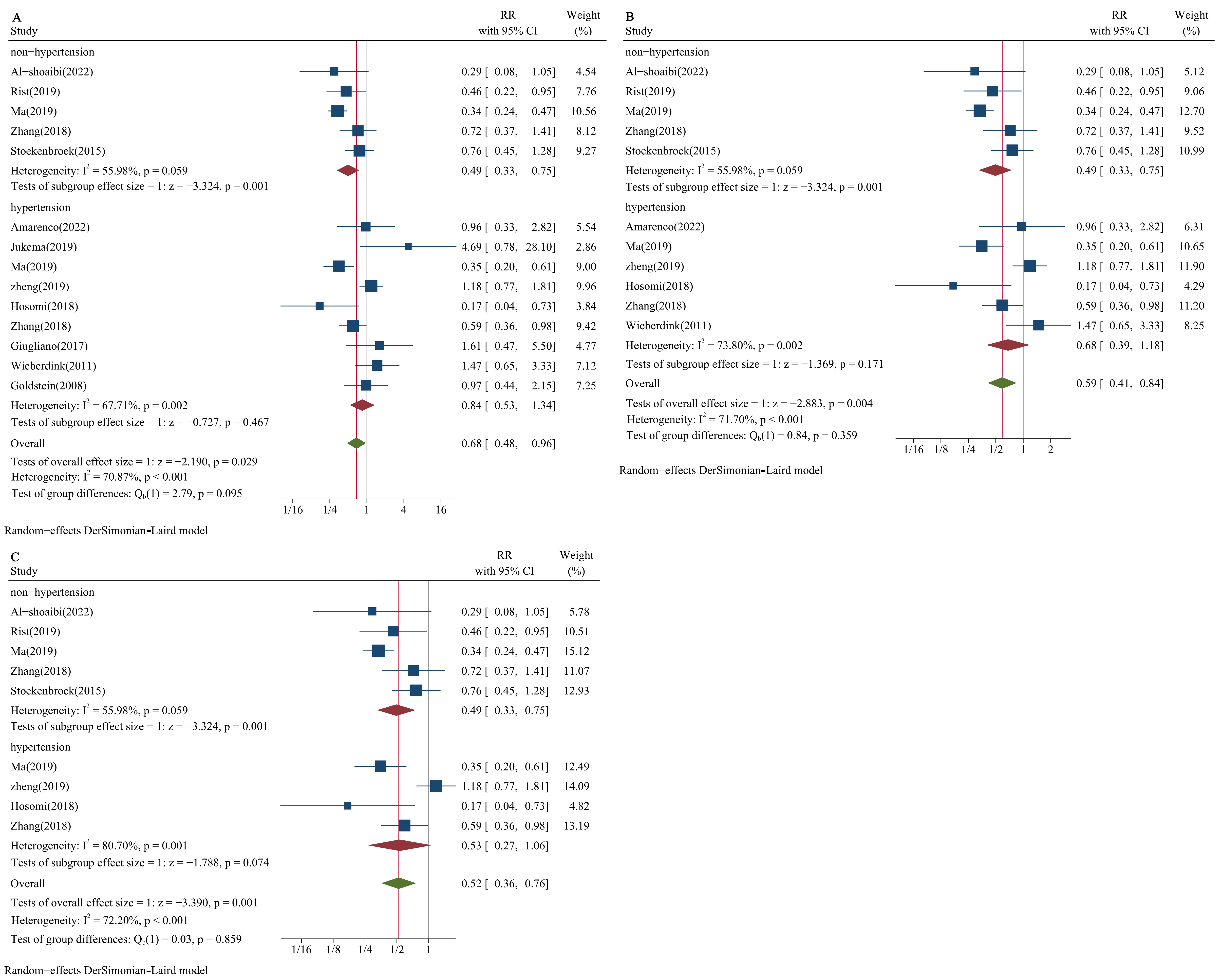 The results for proportions of the study population with hypertension of 60%, 65%, and 75% were consistent. The pooled RRs for the risk of HS between the median and low LDL-C level groups in the hypertensive population were 0.84 (95% CI: 0.53–1.34; Fig. 4A), 0.68 (95% CI: 0.39–1.18; Fig. 4B), and 0.53 (95% CI: 0.27–1.06; Fig. 4C) for the above three proportions, respectively; the result of pooled RR among non-hypertensive populations was 0.49 (95% CI: 0.33–0.75; Fig. 4A–C).
