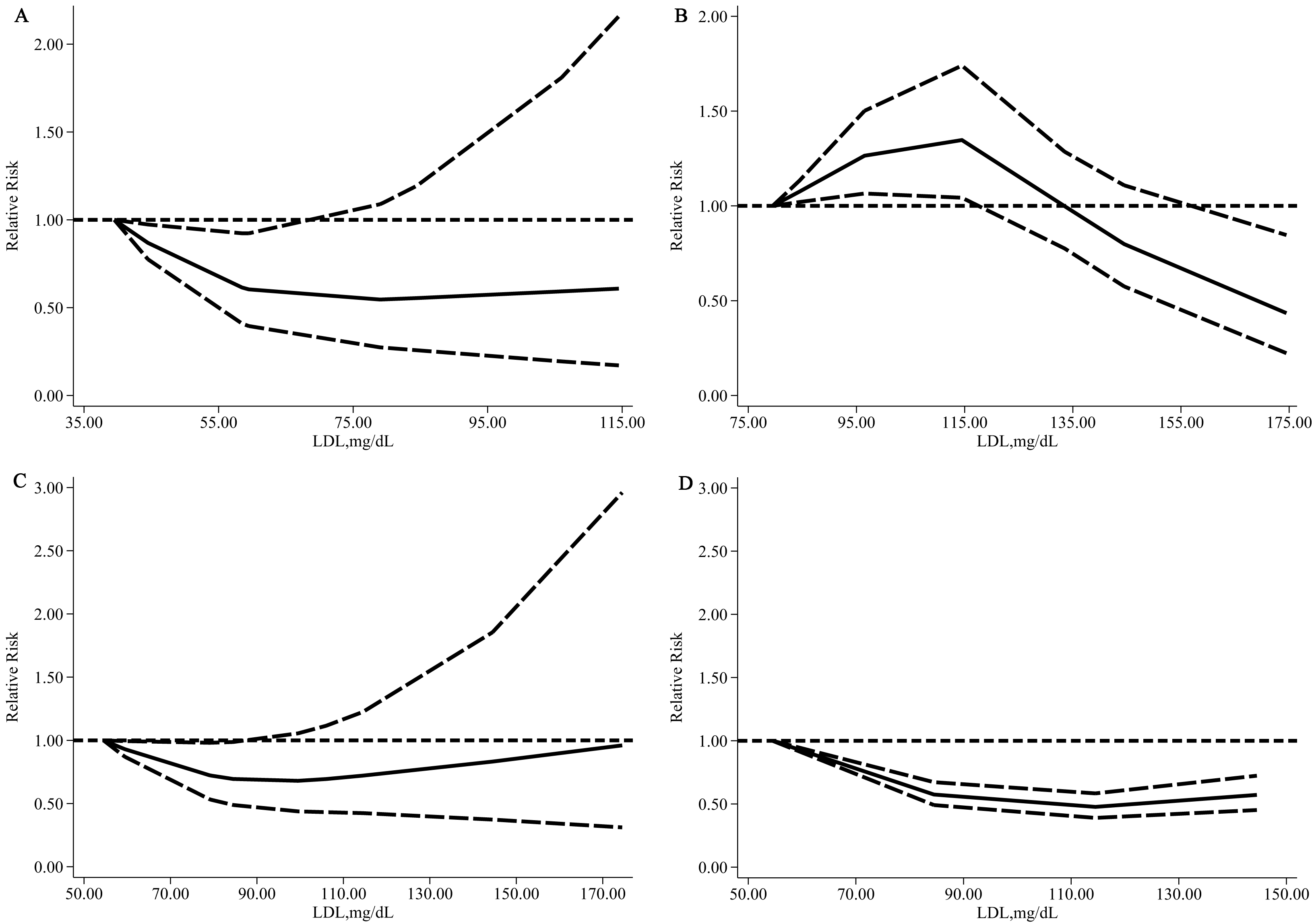 We detected that the lowest risk of HS among non-hypertensive populations was an LDL-C level of approximately 115 mg/dL. In comparison, the lowest risk of HS among hypertensive populations was in an LDL-C level range of 60–80 mg/dL. In addition, the degree of risk reduction of HS was greater; the effective lowering LDL-C range (95% CI of RR did not conclude 1) was wider among non-hypertensive populations than among hypertensive populations (Fig. 5B,D).