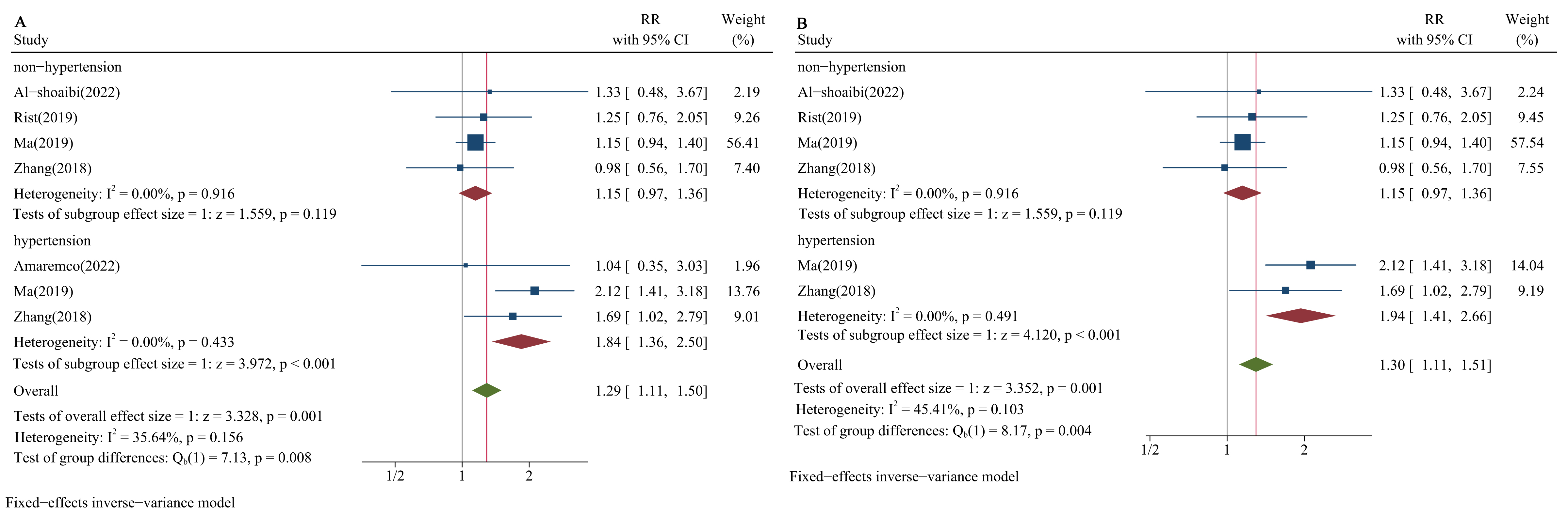 Forest plots of LDL-C and risk of HS stratified by blood pressure status in lower versus optimal. (A) Proportion of hypertension: 65%. (B) Proportion of hypertension: 75%.