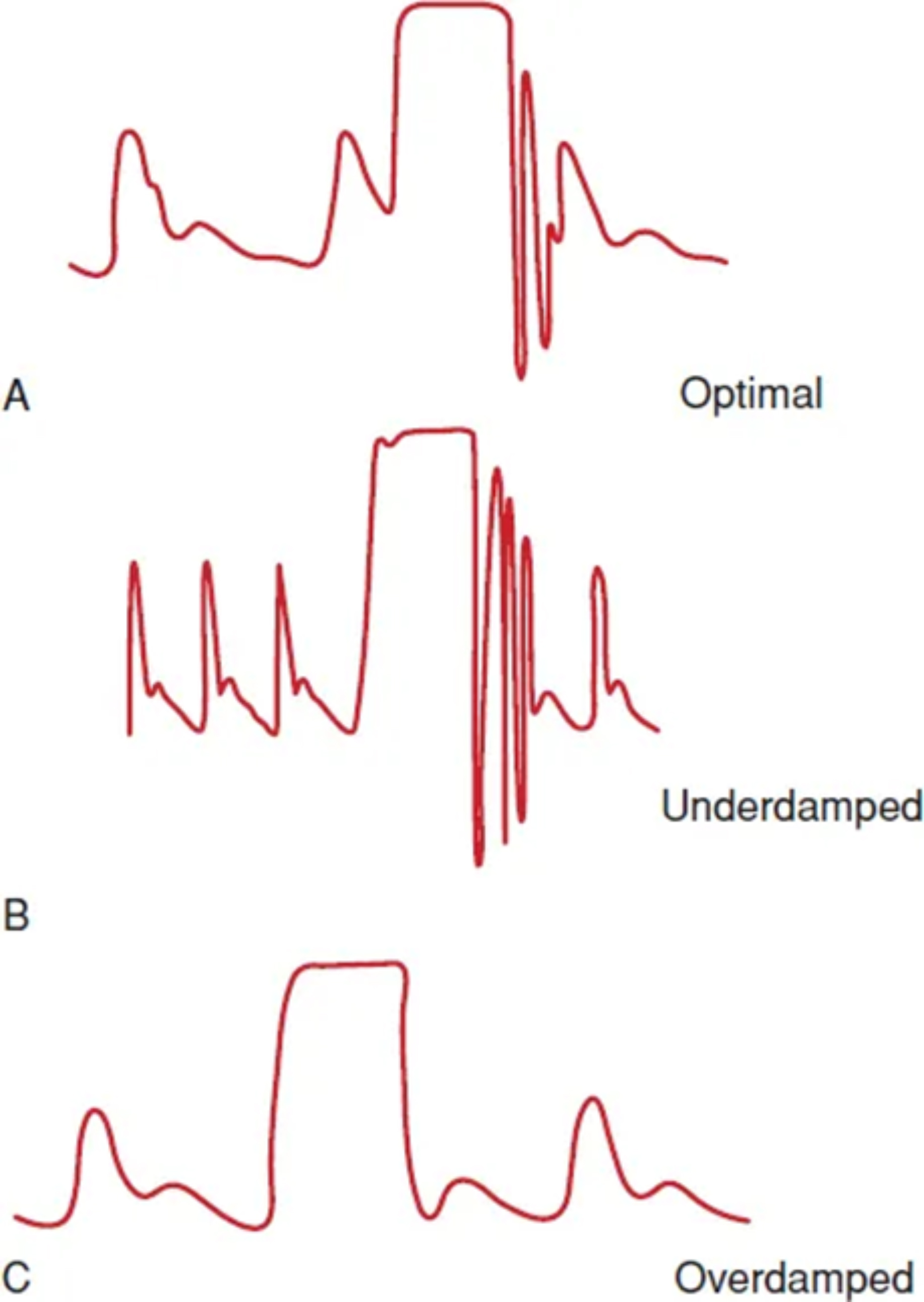 Fig. 1. Common pitfalls in invasive hemodynamic monitoring and pressure waveform analysis. (A) An optimally damped pressure line: the waveform responds with 1–2 oscillations after line flushing. This ensures accurate estimation of pressure values. (B) An underdamped pressure line: the waveform responds with
