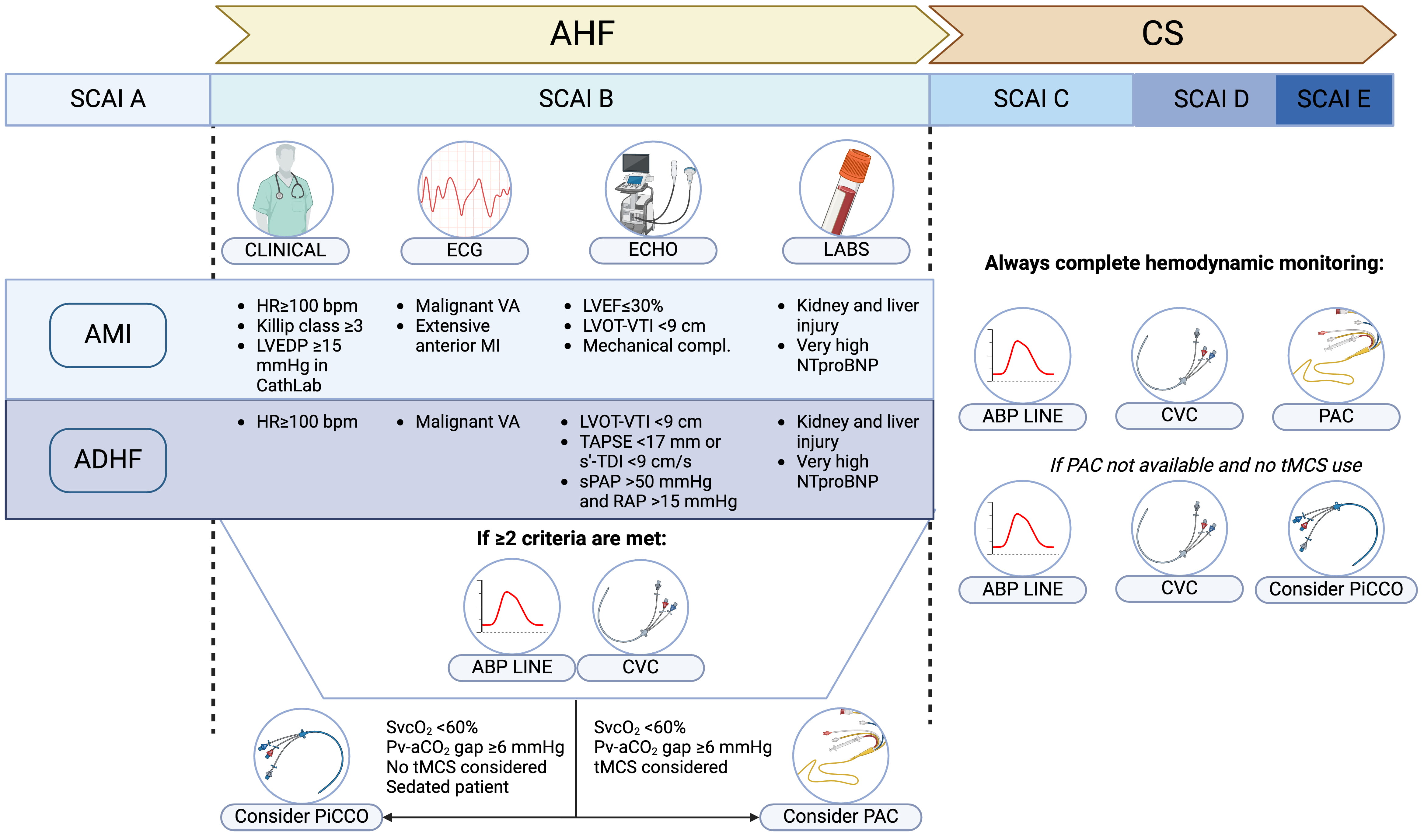 Fig. 2. Pragmatic algorithm for patient and hemodynamic monitoring selection based on the AHF/CS etiology. Select criteria that warrant consideration for hemodynamic monitoring are summarized, based on the CS etiology. In case of AHF and beginning CS (SCAI B), presence of two or more of the proposed criteria warrant insertion of ABP line and CVC; if poor SvCO2 or high Pv-aCO2 gap are measured on the central venous blood sample, PiCCO or PAC insertion should also be evaluated. Notably, PiCCO would not be accurate if tMCS are instituted. In case of over CS (SCAI C or higher) a complete hemodynamic monitoring with ABP line, CVC and PAC is warranted. If PAC has a limited availability, PiCCO offers an alternative, provided that no tMCS are used. ABP, arterial blood pressure; AMI, acute myocardial infarction; ADHF, acute decompensated heart failure; CS, cardiogenic shock; CVC, central venous catheter; HR, heart rate; LVEDP, left ventricular end-diastolic pressure; LVOT, left ventricular outflow tract; PAC, pulmonary artery catheter; Pv-aCO2 gap, veno-arterial CO2 pressure gap; RAP, right atrial pressure; SCAI, Society for Cardiovascular Angiography & Interventions; s’-TDI, s’ wave on tissue Doppler imaging; sPAP, systolic pulmonary artery pressure; SvcO2, central venous oxygen saturation; TAPSE, tricuspid annular plane systolic excursion; tMCS, temporary mechanical circulatory support; VA, ventricular arrhythmia; VTI, velocity-time integral; AHF, acute heart failure; CS, cardiogenic shock; HR, heart rate; ECG, electrocardiogram; ECHO, echocardiography; LABS, laboratory tests; LVEF, left ventricular ejection fraction; VA, ventricular arrhythmias. Fig. 2 was created with Biorender.com.