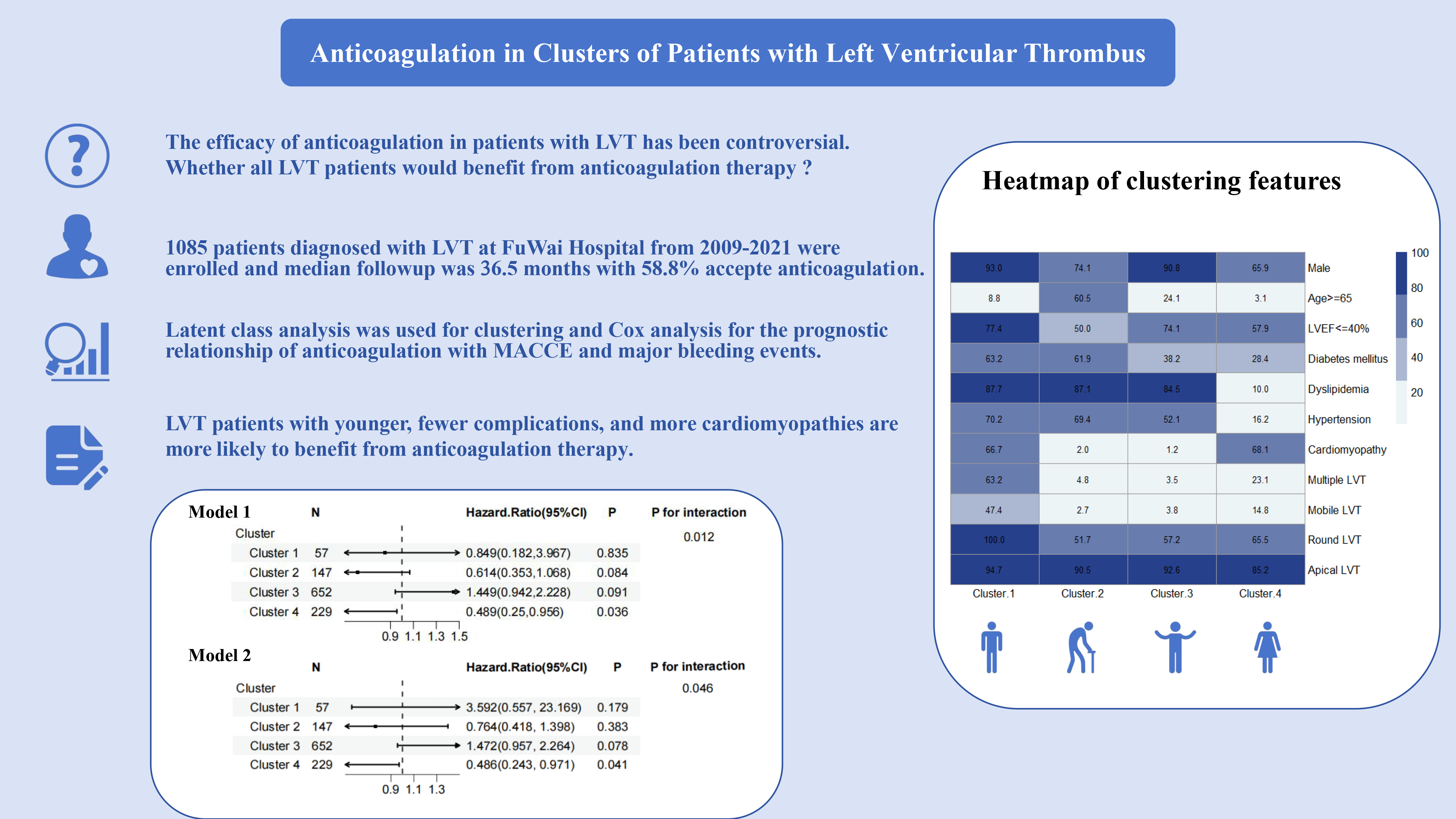 This study included patients diagnosed with LVT at the FuWai Hospital from 2009 to 2021. We performed a latent class analysis (LCA) based on important clinical characteristics to objectively determine the number and dimensionality of clusters. Additionally, Kaplan–Meier curves and a Cox analysis were used to explore the relationship between anticoagulation therapy and MACCEs and major bleeding events in LVT patients.