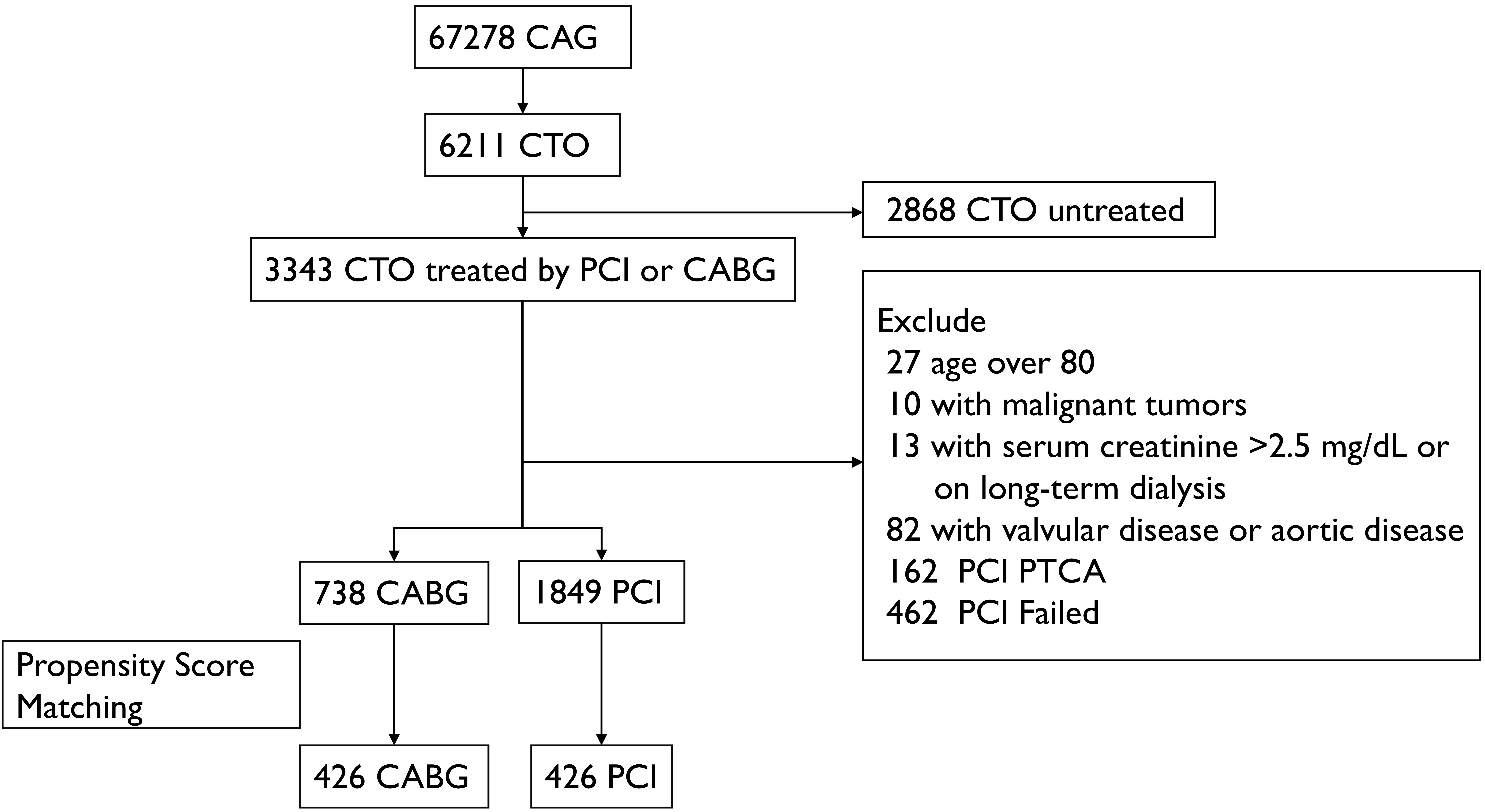 Currently, there are limited data on the clinical outcomes of percutaneous coronary intervention (PCI) compared to coronary artery bypass grafting (CABG) for the treatment of chronic total occlusion (CTO). We compared the clinical outcomes of patients with CTO lesions treated by PCI versus CABG.