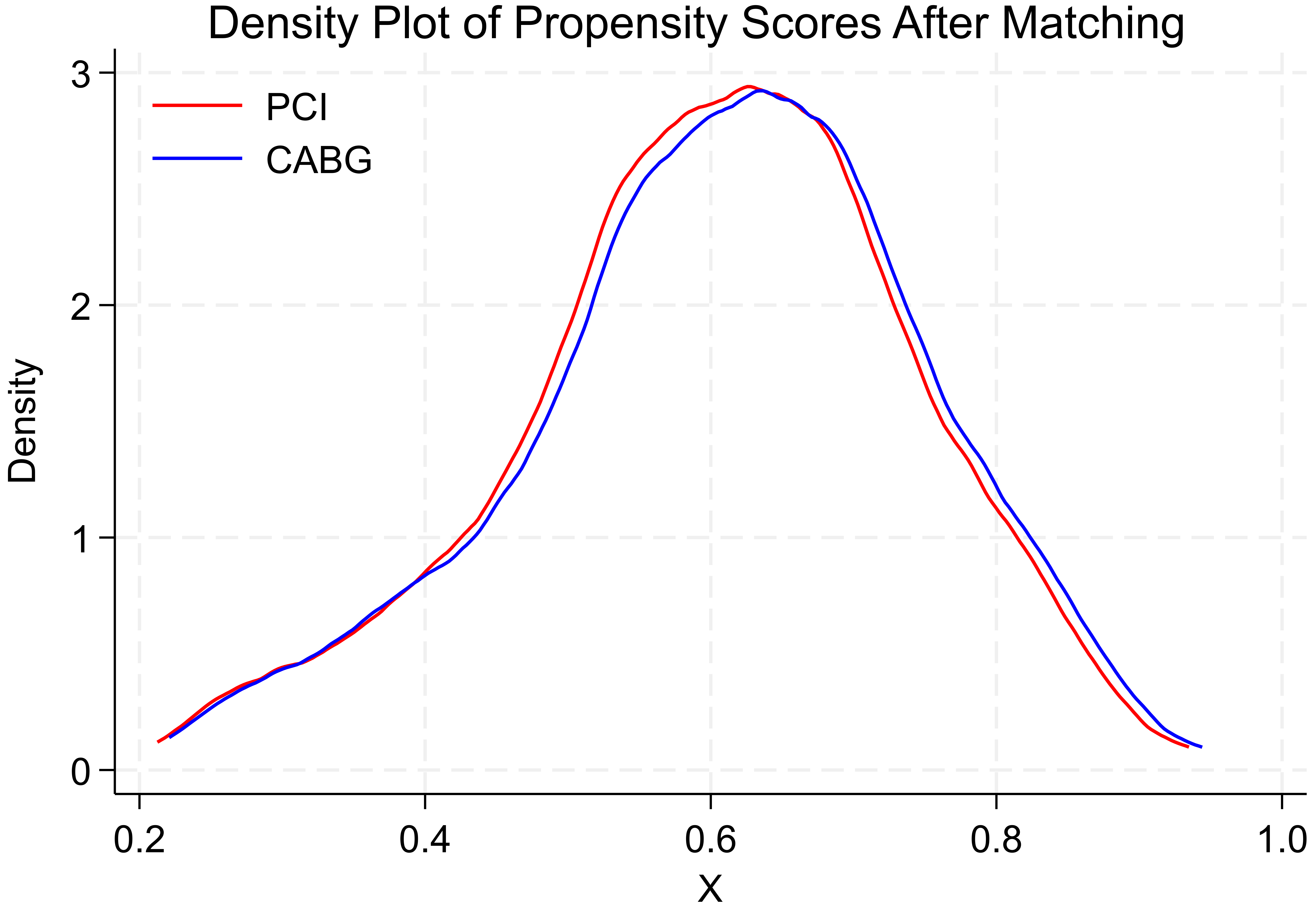 Statistical analyses were conducted using Stata 18.0 (StataCorp LLC, College Station, TX, USA). Baseline characteristics between the PCI and CABG groups were balanced through 1:1 propensity score matching. This matching was performed using a nearest-neighbor algorithm with a caliper width of 0.1 times the standard deviation of the logit of the propensity score. Covariate balance between the groups was evaluated by calculating standardized mean differences. A standardized difference of less than 10.0% indicated an adequate balance between the two cohorts. To assess the overlap of propensity scores between the treatment (PCI) and control (CABG) groups after matching, kernel density estimation was used to plot the distributions. The resulting density plot visually demonstrated an overlap of propensity scores, confirming that balance was achieved between the groups (Fig. 2).