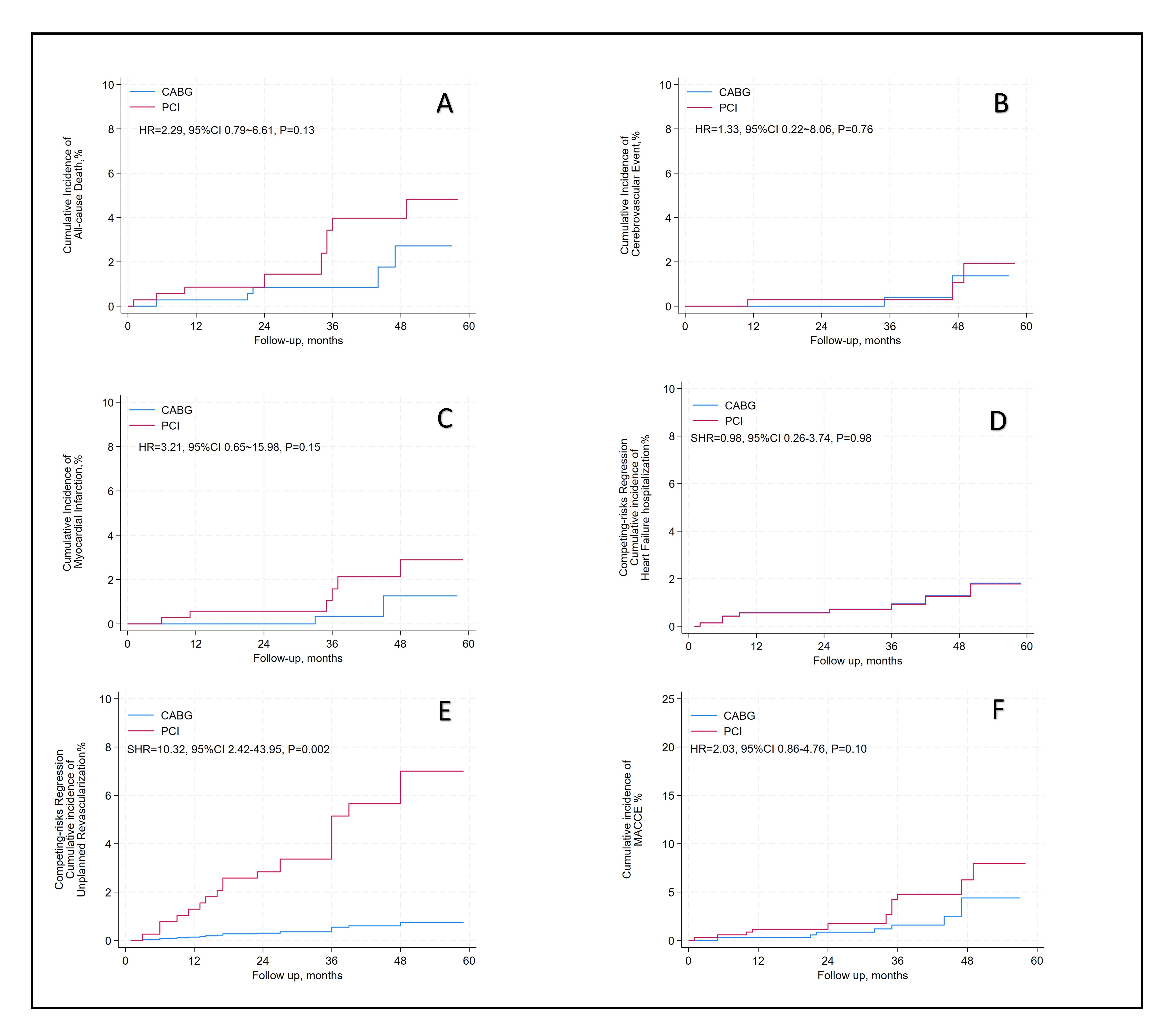 Fig. 4. Long-term clinical outcomes of PCI versus CABG. (A) All-Cause Death. (B) Cerebrovascular Events. (C) Myocardial Infraction. (D) Heart Failure Hospitalization. (E) Unplanned Revascularization. (F) MACCE. Abbreviations: PCI, percutaneous coronary intervention; CABG, coronary artery bypass grafting; MACCE, major adverse cardiac and cerebrovascular events, assessed as all-cause death, cerebrovascular event, and myocardial infraction. The calculated sub distribution hazard ratio (SHR) for “heart failure hospitalization” and “unplanned revascularization” represents the SHR, with all-cause death considered the competing event.