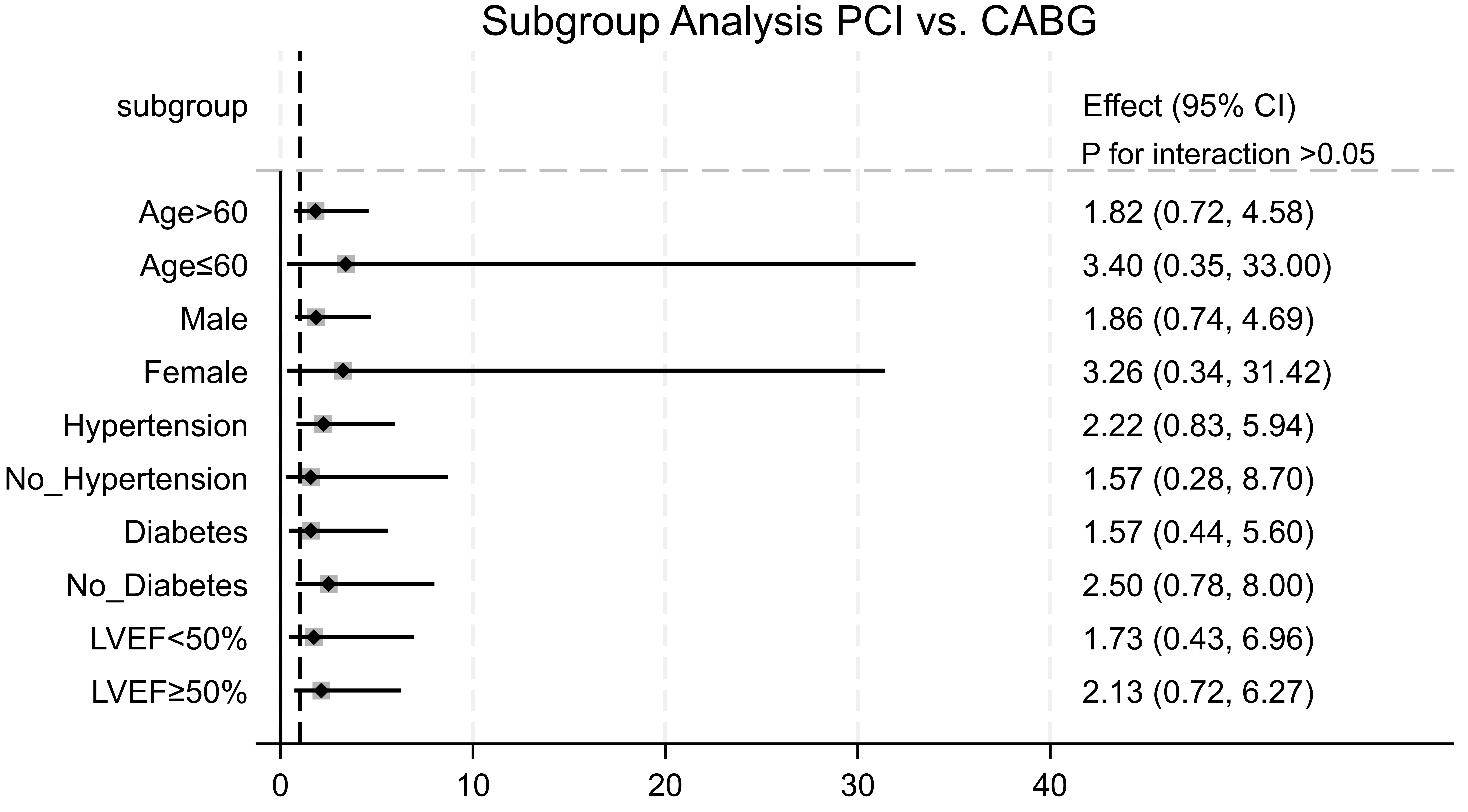 We conducted subgroup analyses to evaluate the potential association between treatment strategy and MACCE in different subpopulations. The comparative effectiveness of PCI and CABG showed no significant variation across subgroups, irrespective of age, sex, comorbidities (e.g., diabetes mellitus and hypertension), LVEF, or LAD-CTO (all p