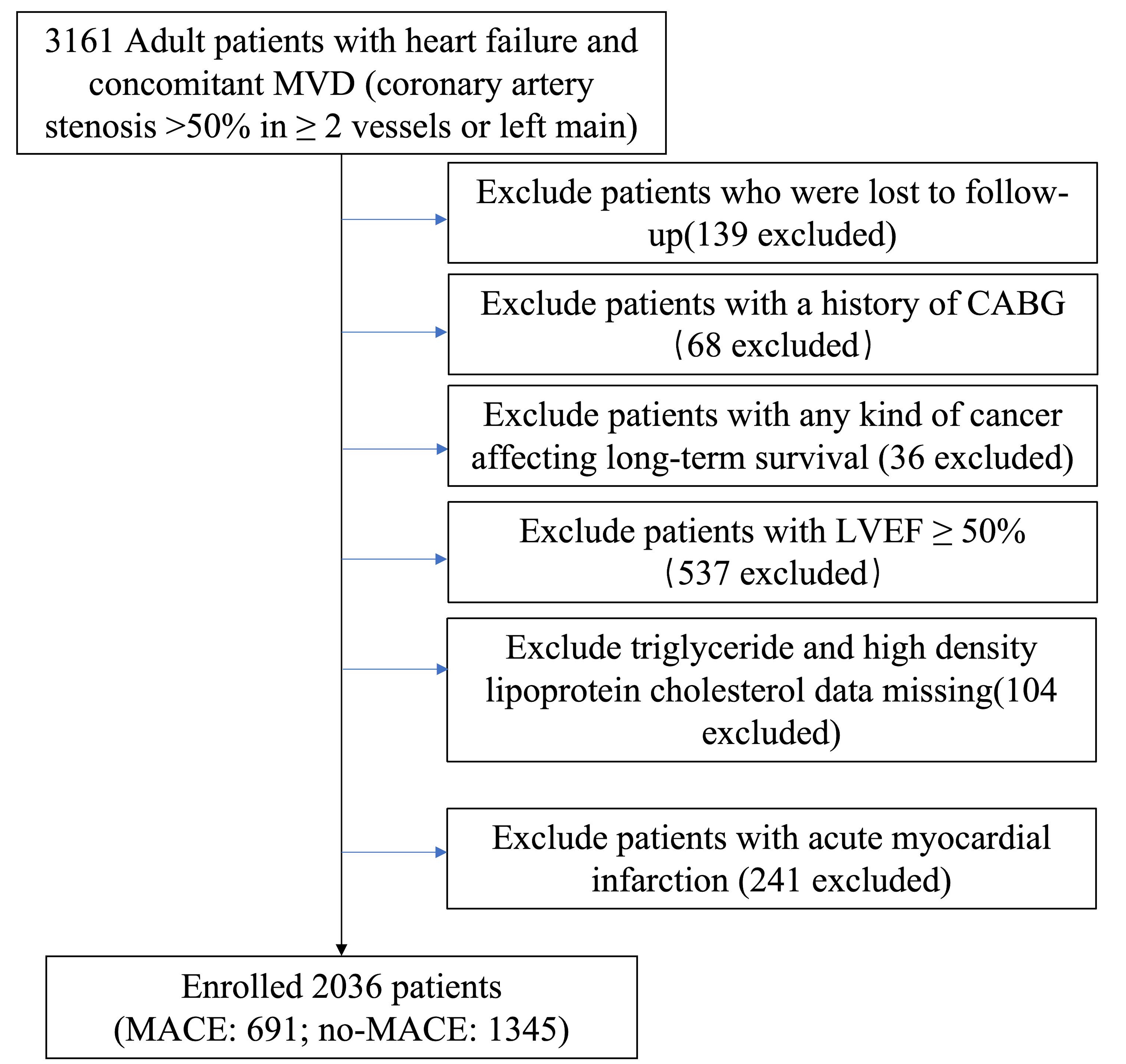 Fig. 1. Diagram of study process. Abbreviations: MVD, multivessel disease; CABG, coronary artery bypass grafting; LVEF, left ventricular ejection fraction; MACE, major adverse cardiovascular events.