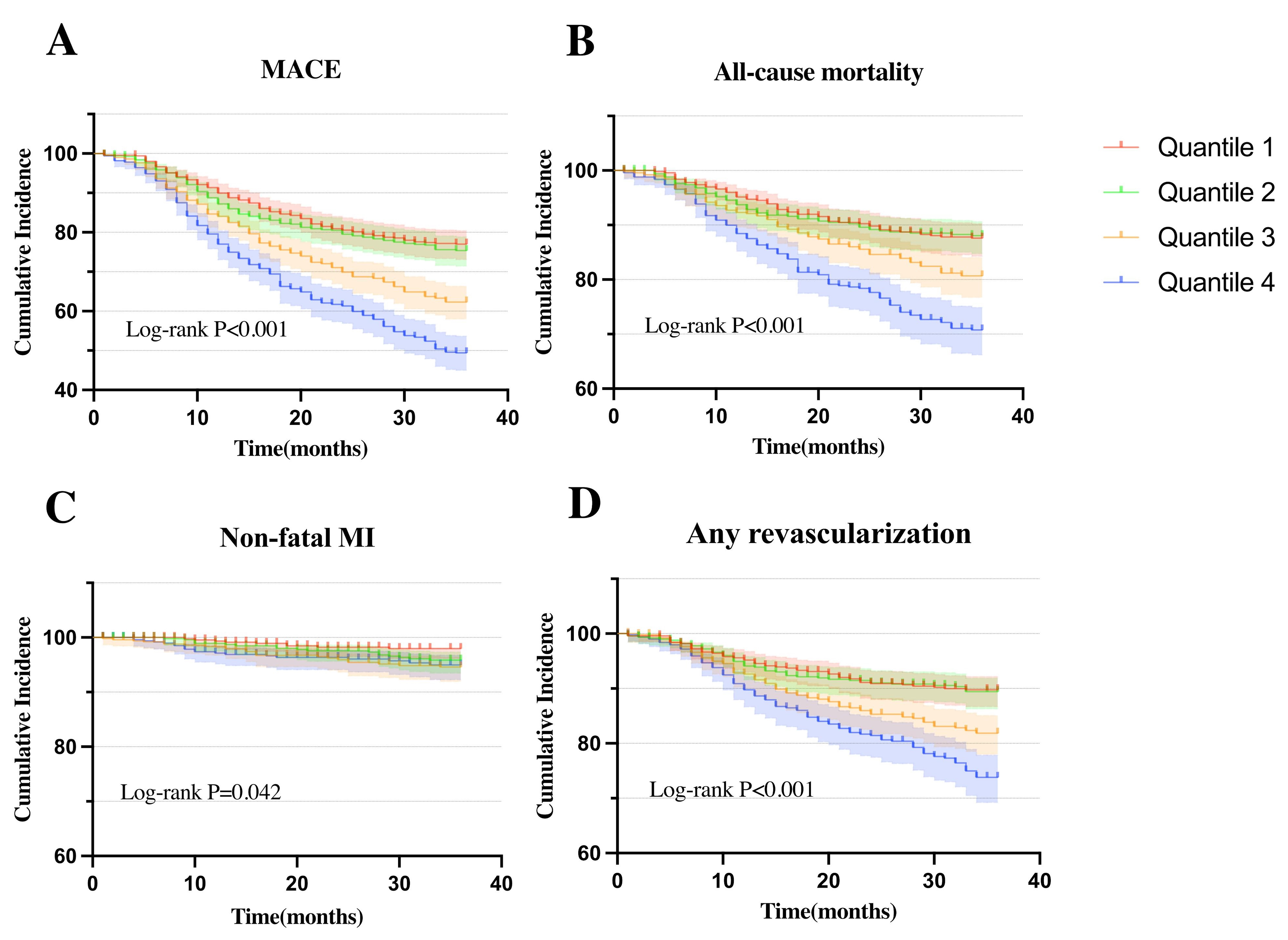 Fig. 2. Kaplan-Meier curves for cumulative incidence of clinical outcomes stratified by quartiles. (A) Kaplan-Meier curves of MACE. (B) Kaplan-Meier curves of all-cause mortality. (C) Kaplan-Meier curves of non-fatal MI. (D) Kaplan-Meier curves of any revascularization.