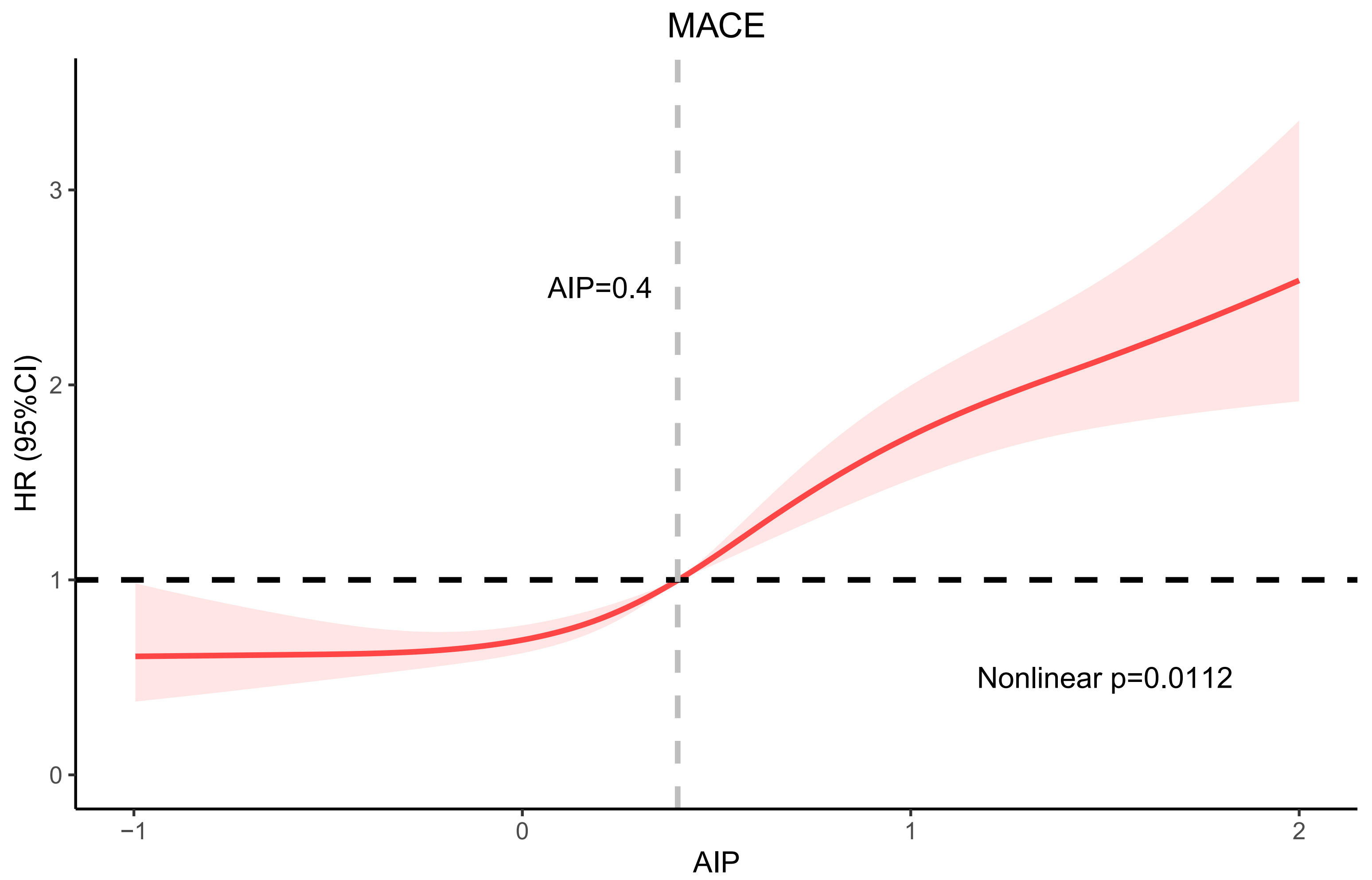 In Fig. 3, RCS was applied to investigate the relationship between AIP and MACE: a high AIP value was non-linearly relevant to increased MACE risk (non-linear, p = 0.0112).