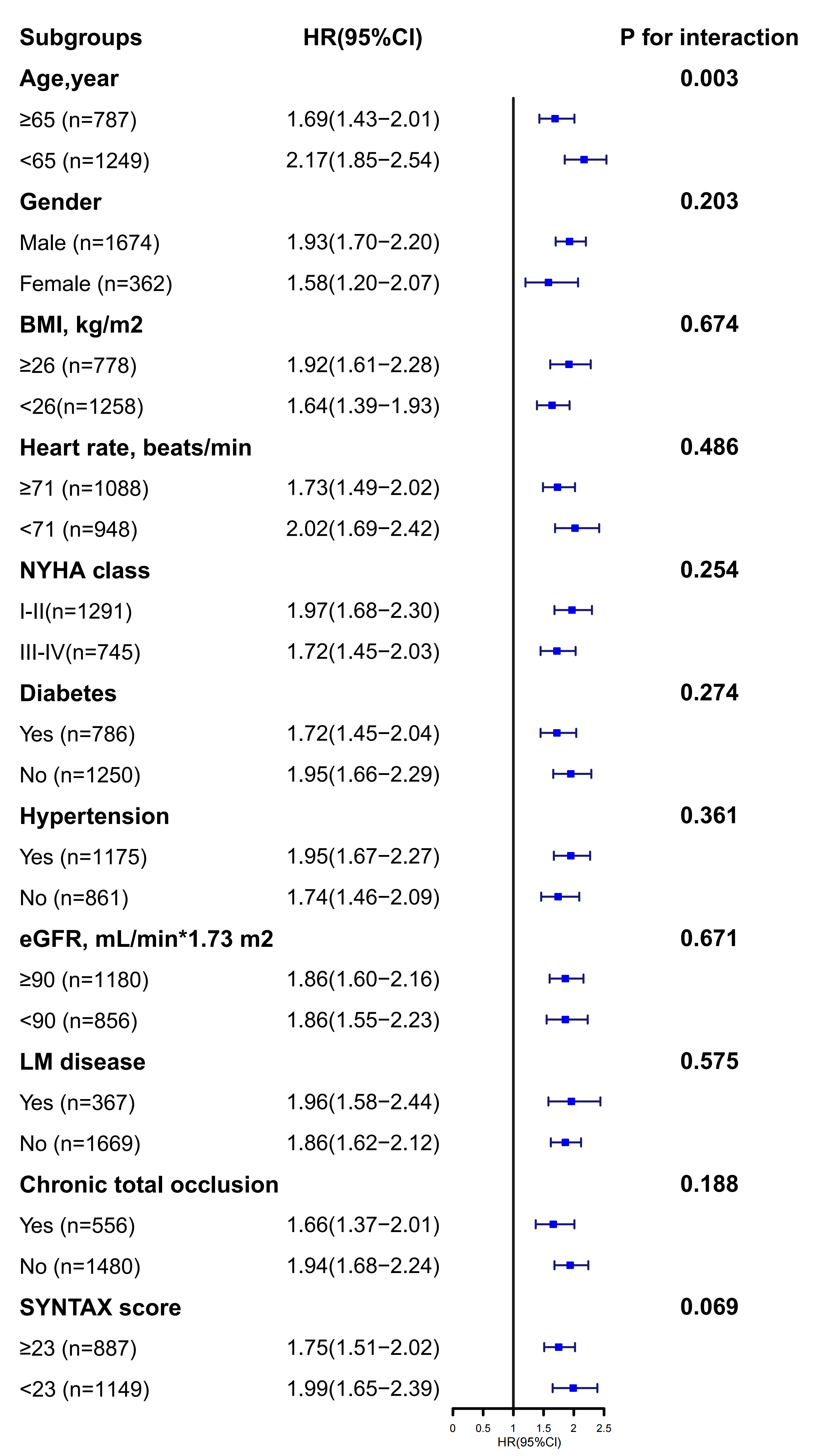 In Fig. 4, significant interactions were not detected in the majority of subgroups, except for the age subgroup. The predictive value of AIP for MACE was notably stronger in the younger patient subgroup (pinteraction = 0.003).