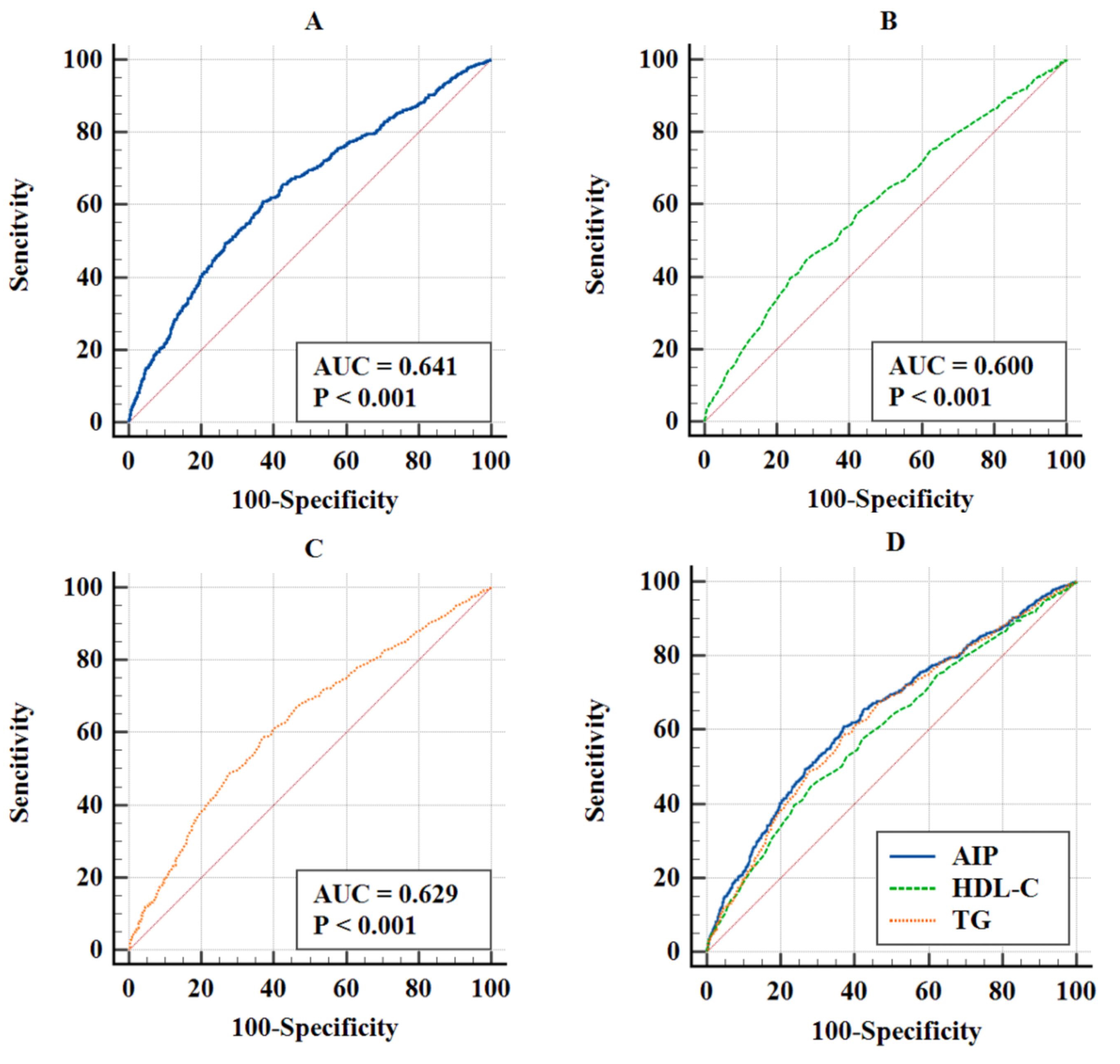 Fig. 5. ROC curves for predicting MACE. (A) ROC curves of AIP. (B) ROC curves of HDL-C. (C) ROC curves of TG. (D) ROC curves of AIP, HDL-C, TG to MACE. Abbreviation: ROC, receiver operating characteristic.
