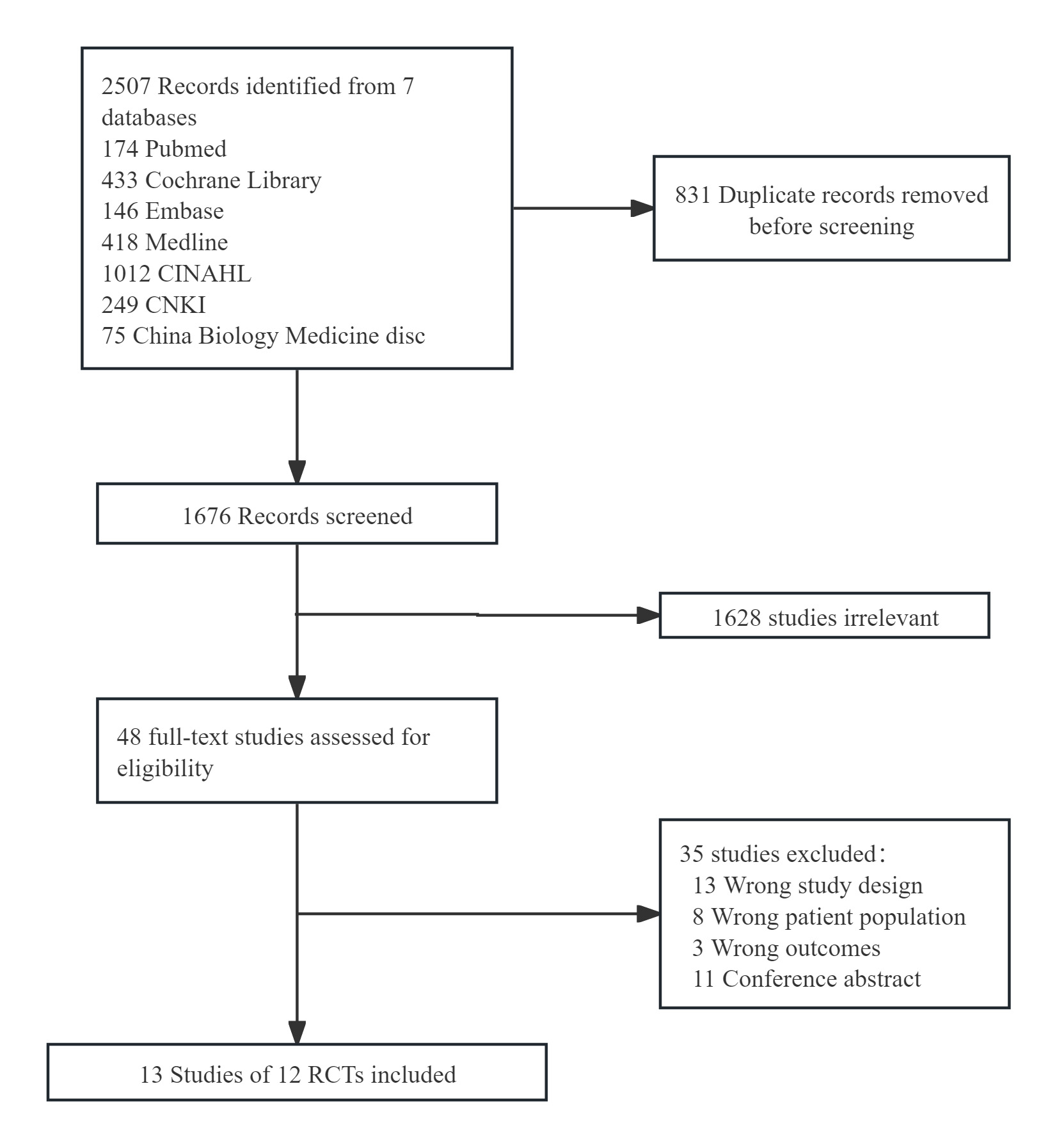 Of the 2507 records identified from the initial database search, 1676 records screened for eligibility by a reading of the title and abstract after duplicates were removed. We retrieved the full texts of 48 articles for further assessment and ultimately included 13 articles covering 12 RCTs for meta-analysis [13, 14, 15, 25, 26, 27, 28, 29, 30, 31, 32, 33]. Fig. 1 illustrates the flowchart of the study selection process.