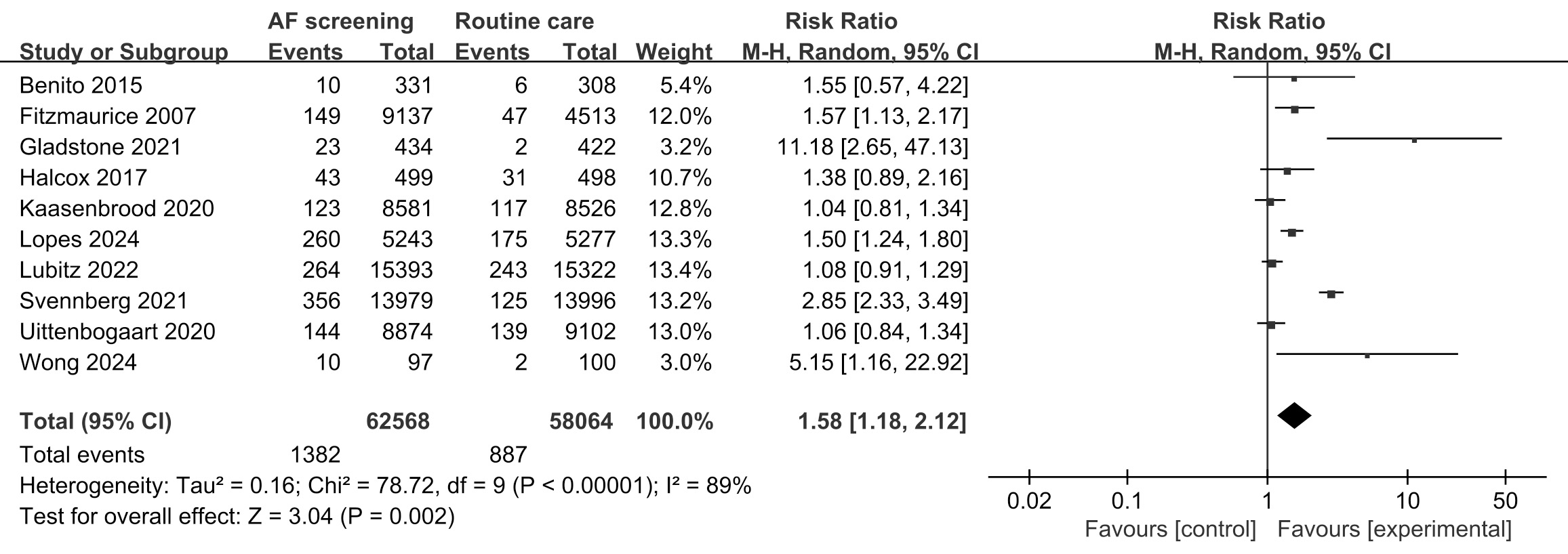 This review has several limitations. First, a high level of heterogeneity was observed among the included studies on the AF detection rate, although subgroup analysis was performed to explore the causes of the heterogeneity. Second, the limited number of clinical outcomes (e.g., stroke, death, major bleeding) reported in some of the trials may decrease the power of this review in detecting the true effects of screening. Third, the variability in participants might weaken the generalizability of the findings.
