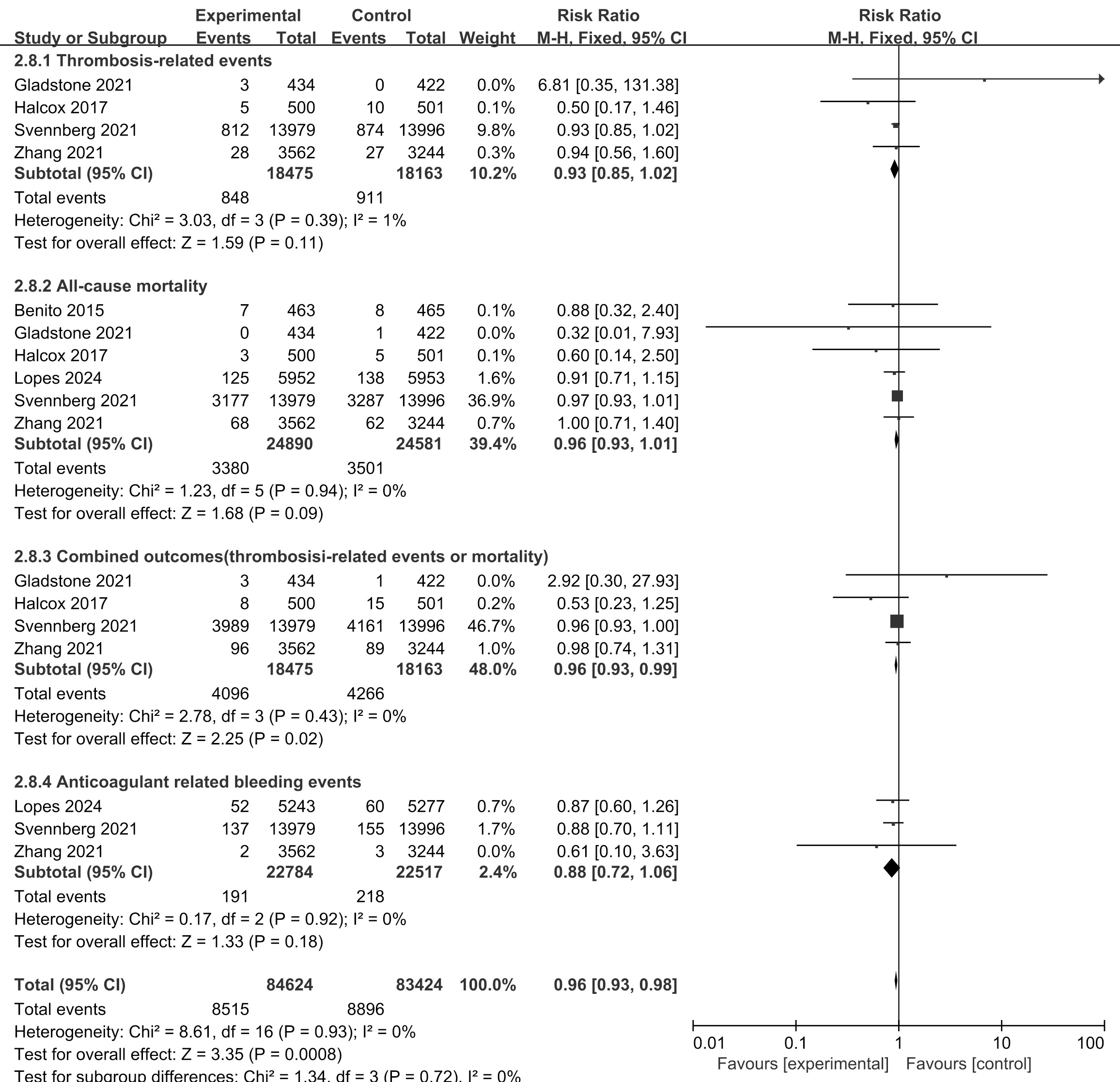 Four studies [13, 14, 15, 27] compared systematic screening and routine practice in terms of stroke prevention, and six reported the endpoint of all-cause mortality [13, 14, 15, 25, 27, 29]. Compared with usual care, systematic screening was associated with a lower risk for the composite endpoint (combination of thrombosis-related events and mortality) (RR, 0.96; 95% CI, 0.93 to 0.99; p = 0.02) but not for the individual endpoints (Fig. 4).