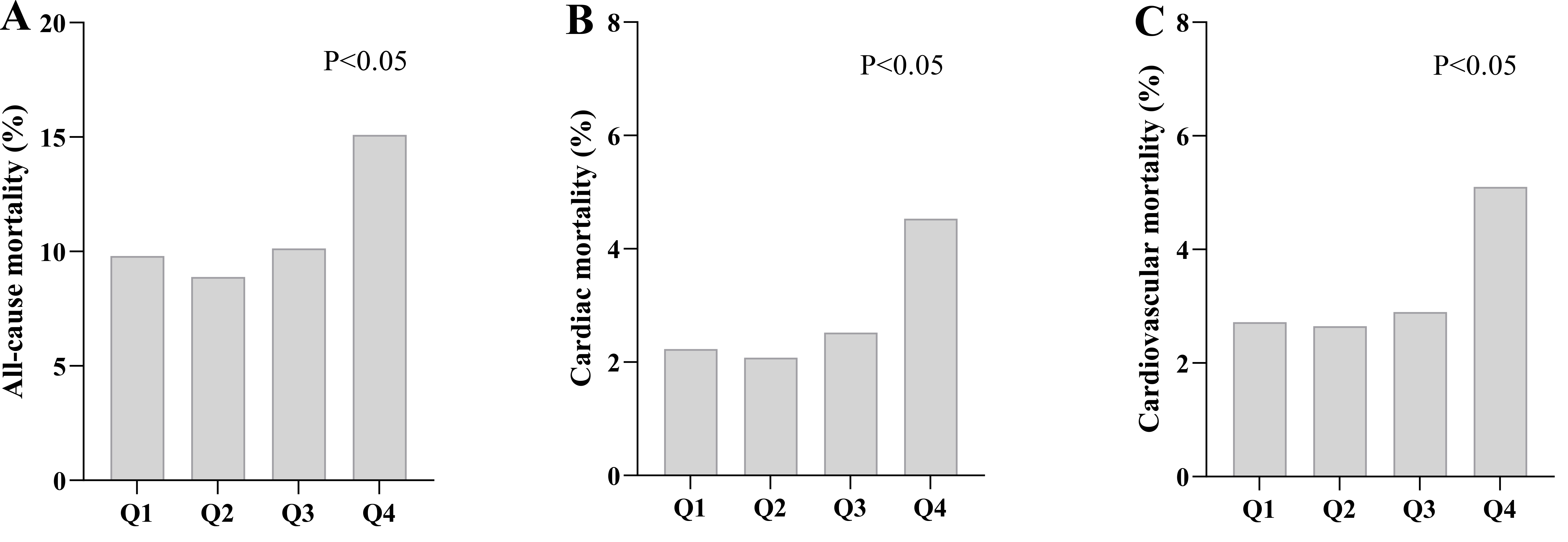 Fig. 3. Kaplan–Meier cumulative risk curve for cardiac events. (A) All-cause mortality. (B) Cardiac mortality. (C) Cardiovascular mortality. Abbreviations: Q1, first quartile; Q2, second quartile; Q3, third quartile; Q4, fourth quartile.