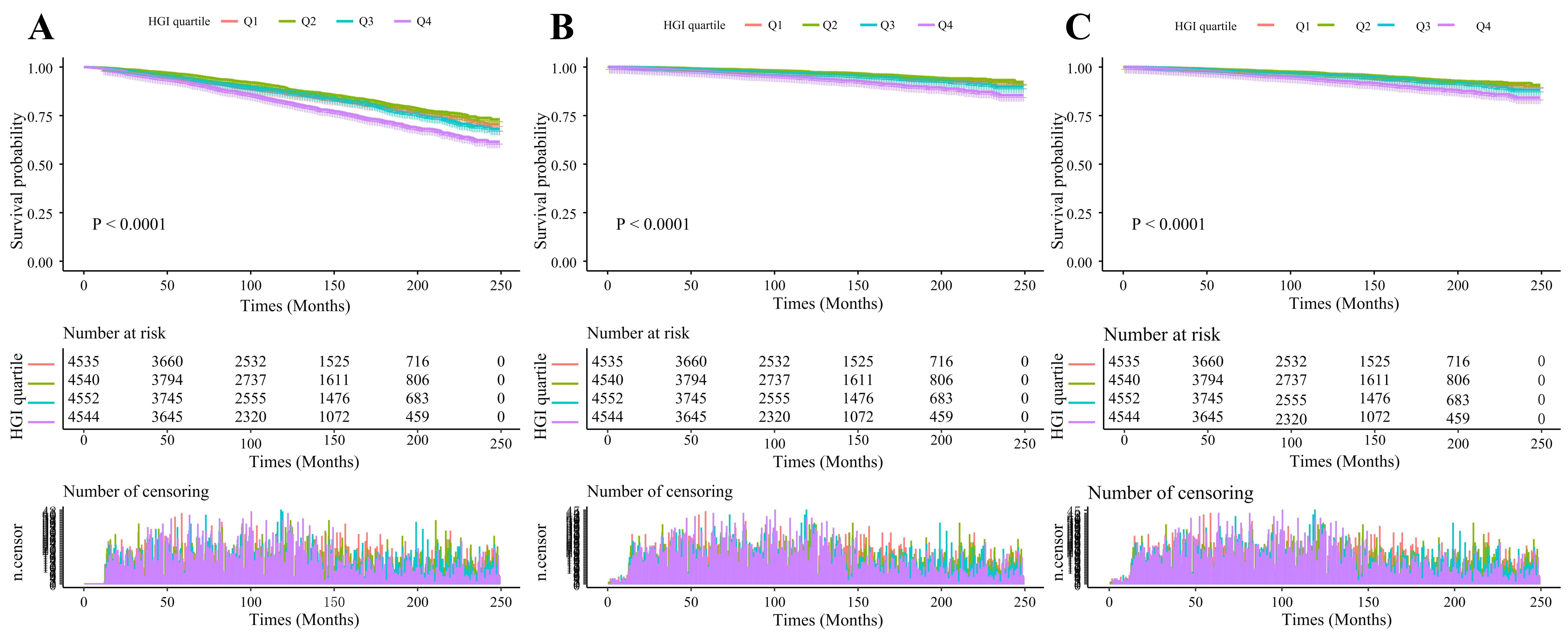 Fig. 2. Comparison of the incidence of cardiac events in the HGI quartile population. Correlation between HGI and outcome events. (A) Comparison of all-cause mortality between groups based on HGI quartiles. (B) Comparison of cardiac mortality between groups based on HGI quartiles. (C) Comparison of cardiovascular mortality between groups based on HGI quartiles. Abbreviations: Q1, first quartile; Q2, second quartile; Q3, third quartile; Q4, fourth quartile.